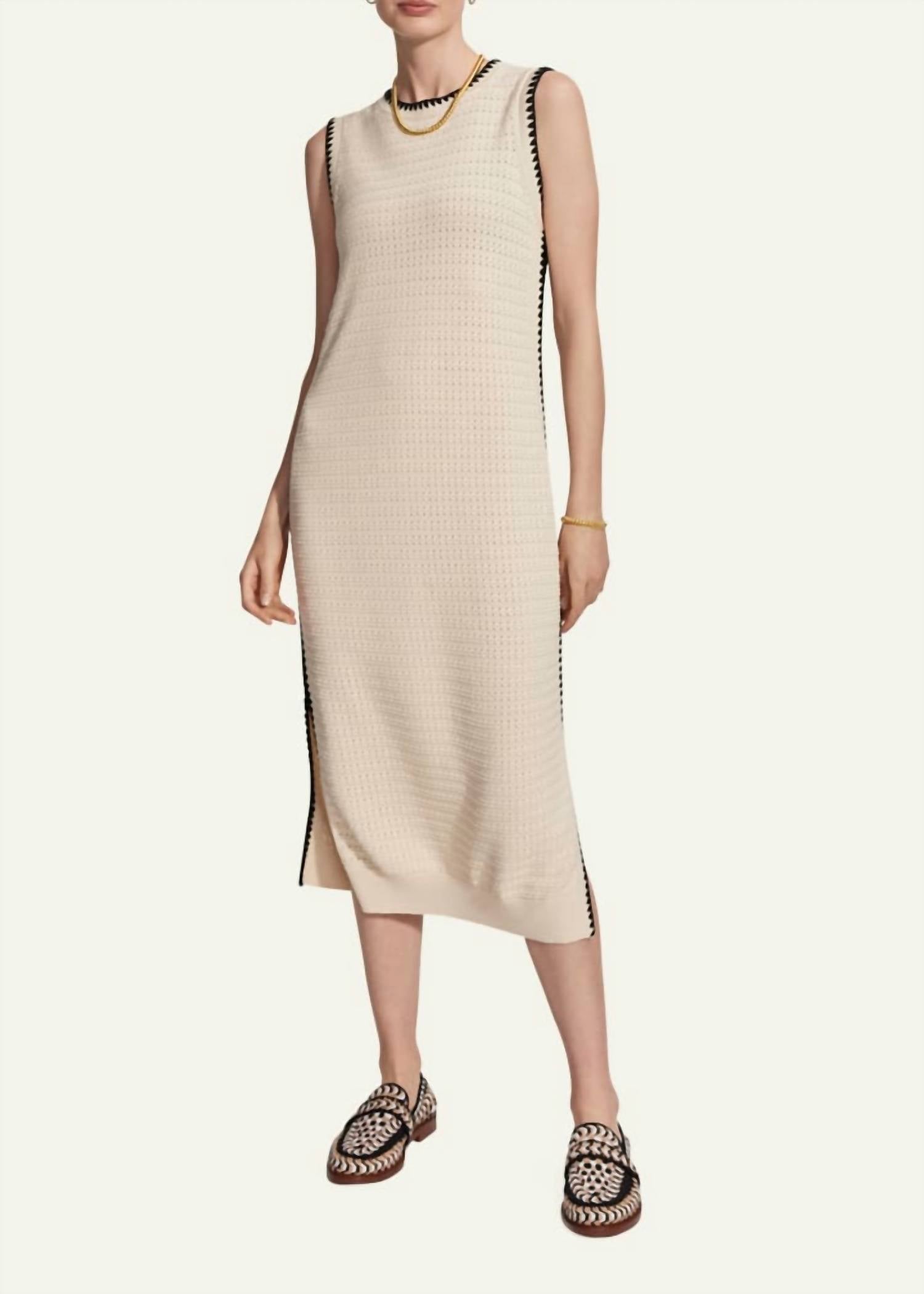 Um vestido midi tão versátil que suas opções de uso são infinitas. Conheça o Vestido Regata Dwight da VARLEY, uma escolha estilosa para as férias de primavera com seu comprimento midi moderno e mangas curtas. Confeccionado em 100% algodão, este vestido texturizado e prático apresenta gola careca e acabamento recortado contrastante para um detalhe chique. Ideal para combinar com sandálias, ele vem em uma cor bétula suave com acabamento preto, perfeito tanto para dias de praia quanto para saídas à noite. As instruções de cuidado incluem lavar à máquina em temperatura fria, passar a ferro em temperatura baixa e secar na horizontal.