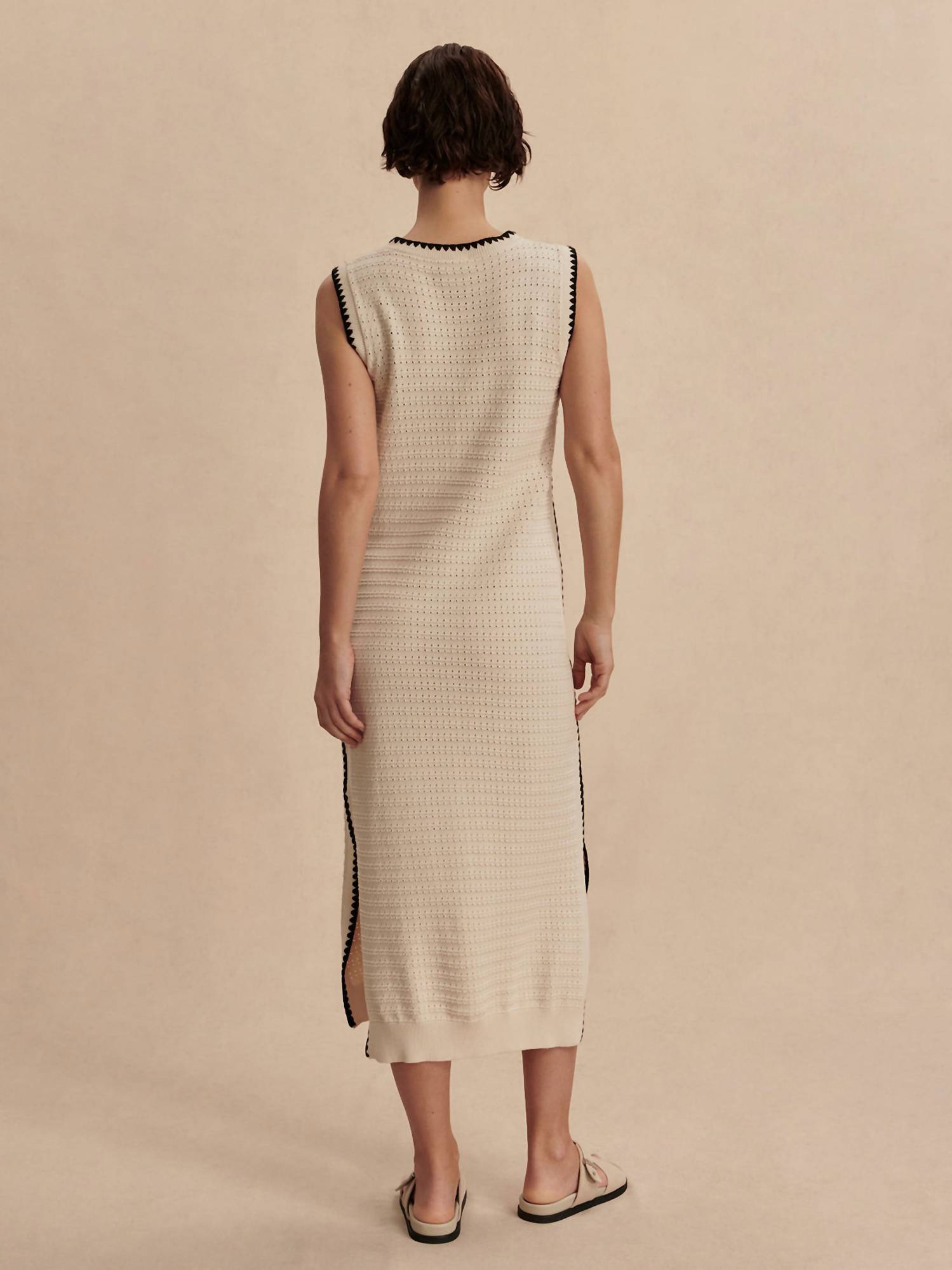 Discover the Dwight Tank Knit Midi Dress by VARLEY, a striking addition to your summer collection. This sleeveless dress, crafted from 100% Cotton, features a refined textured crochet design in a chic birch hue. Its flattering A-line silhouette provides an elegant 48.4-inch length, complemented by a crewneck and sleek black piping accents. This pull-on piece, perfect for boho chic vibes, is ideal for holiday parties and requires machine wash with a lay flat to dry instruction.