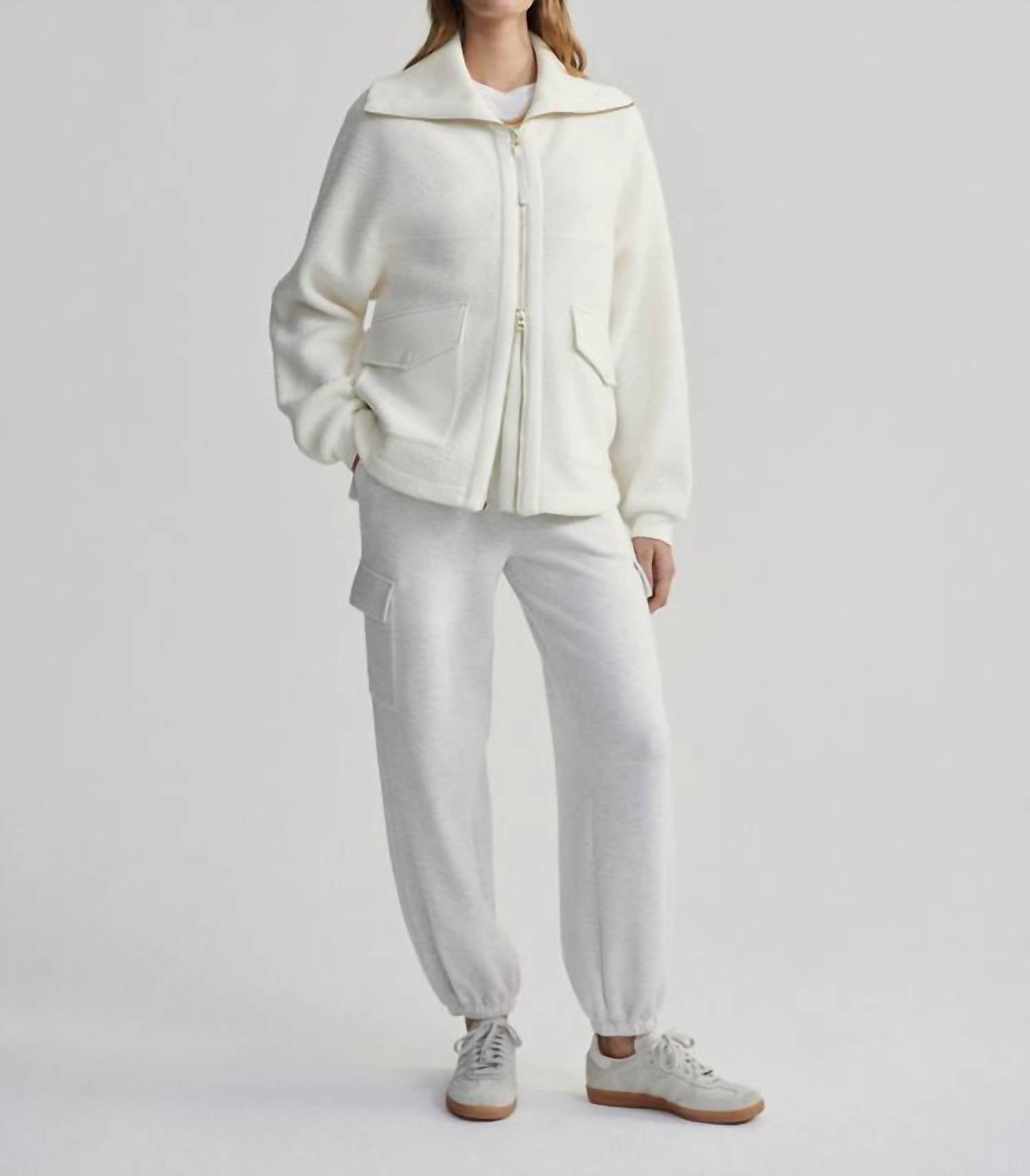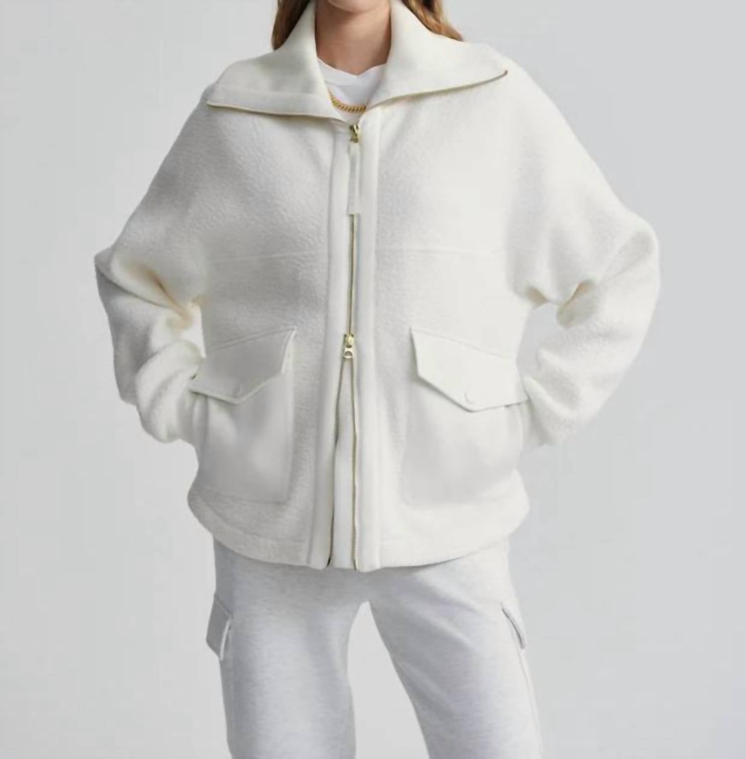 Esta jaqueta, confeccionada em Fleece Borg Plush 100% poliéster, possui mangas compridas e um caimento solto, com comprimento frontal de 66 cm. Possui um prático fecho de zíper e bolsos DoubleSoft para maior praticidade. Pode ser lavada na máquina.