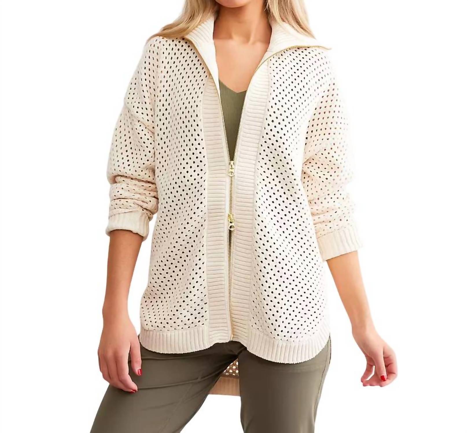 Bonita, casual e confortável. Esta jaqueta é um item essencial. Jaqueta casual de manga comprida com costura aberta, confeccionada em 100% algodão, proporcionando um efeito transparente e arejado, perfeito para sobreposições. Possui fecho de zíper e bainha alta e baixa, garantindo versatilidade e estilo o ano todo. As medidas incluem 107 cm de largura de busto e 63 cm de comprimento no tamanho P. As instruções de cuidado recomendam lavagem à máquina com água fria.