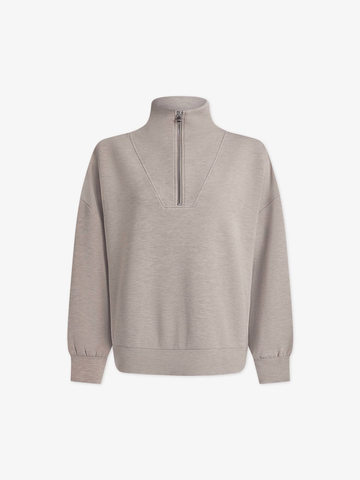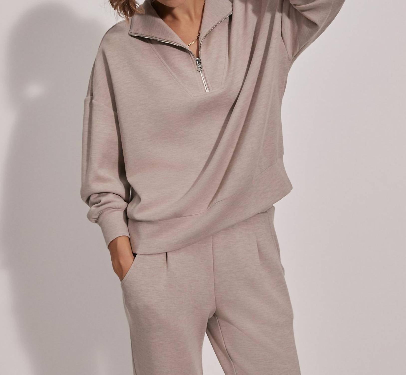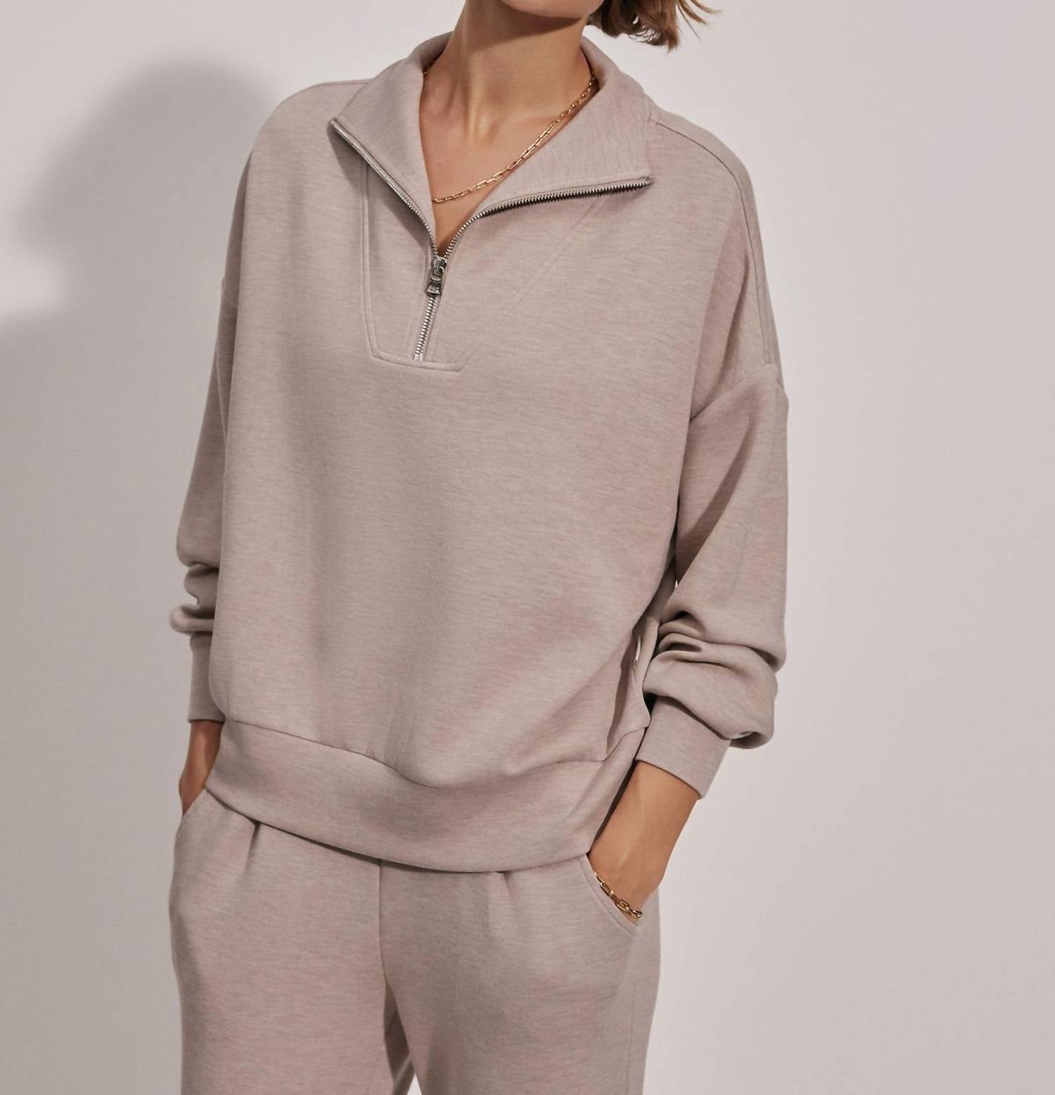 Temperaturas mais frias pedem camadas de roupa e nós amamos este moletom adorável por todos os motivos óbvios. O suéter Hawley Half Zip da VARLEY na versátil cor taupe é um item essencial em qualquer guarda-roupa. Confeccionado em uma luxuosa mistura de viscose, este moletom de manga comprida oferece um caimento oversized com gola com painéis e meio zíper, punhos profundos com barra. Comprimento da peça: 23,4 polegadas. Fechamento: Fecho de zíper. Cuidados: Lavar à máquina e secar na horizontal.
