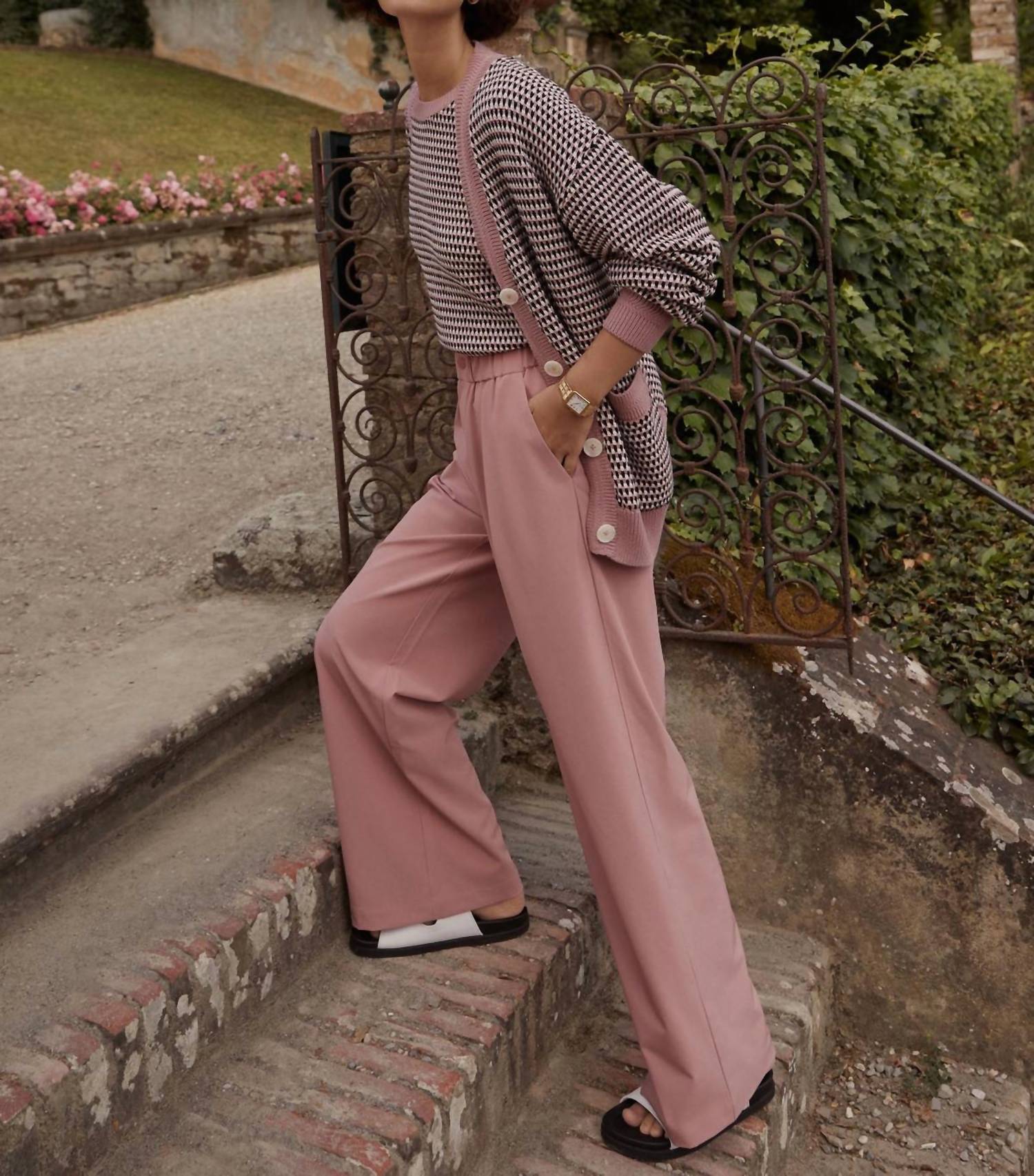 Introducing the Kayson Wide Leg Mid Rise Pants by VARLEY in a sophisticated Ash Rose hue, perfect for the modern wardrobe. These women's pants feature a relaxed fit with a wide leg silhouette, enhanced by central front pleating. Crafted from lightweight polyester, they offer a flattering mid-rise and practical pockets, secured with a zip closure. Perfect for spring workwear, these pants are machine washable and should be line dried, with a 29.5" inseam for a stylish, comfortable fit.