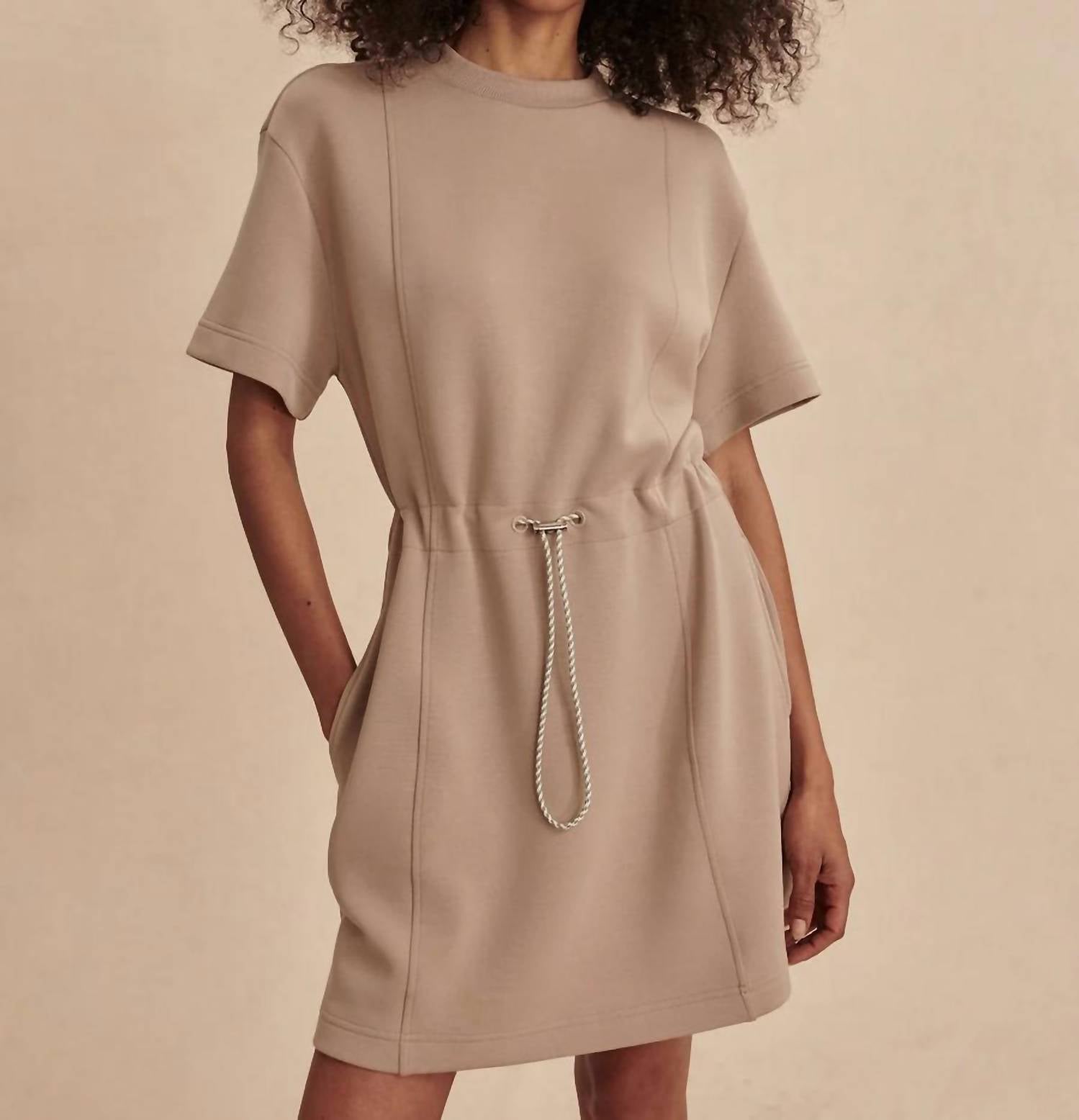 This is a crew-neck t-shirt dress crafted from super-soft, comfortable fabric. Falling above the knee, it features a cinched waist with adjustable toggles, side pockets, and subtle seam detailing for a flattering, easy-to-wear silhouette.