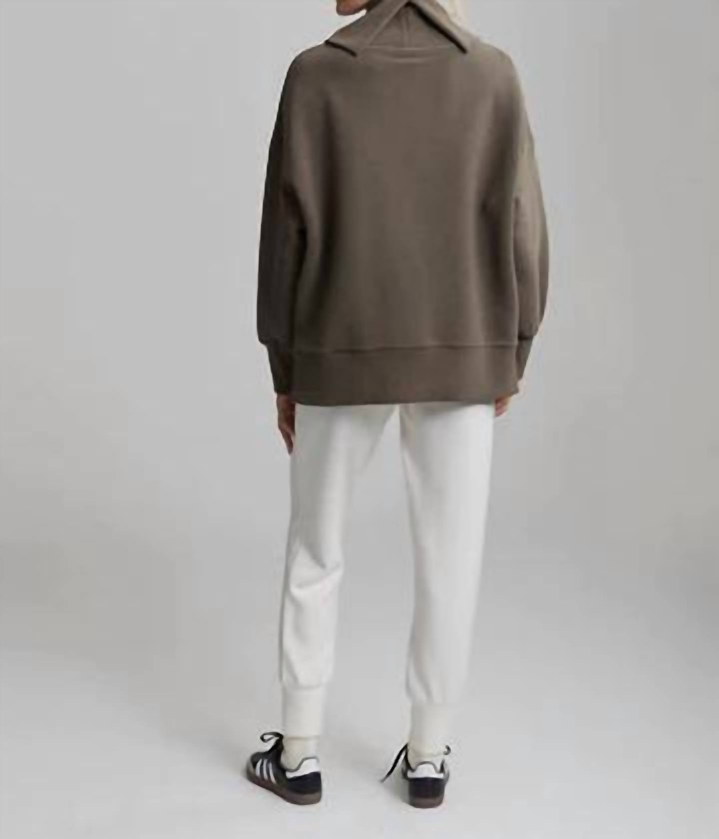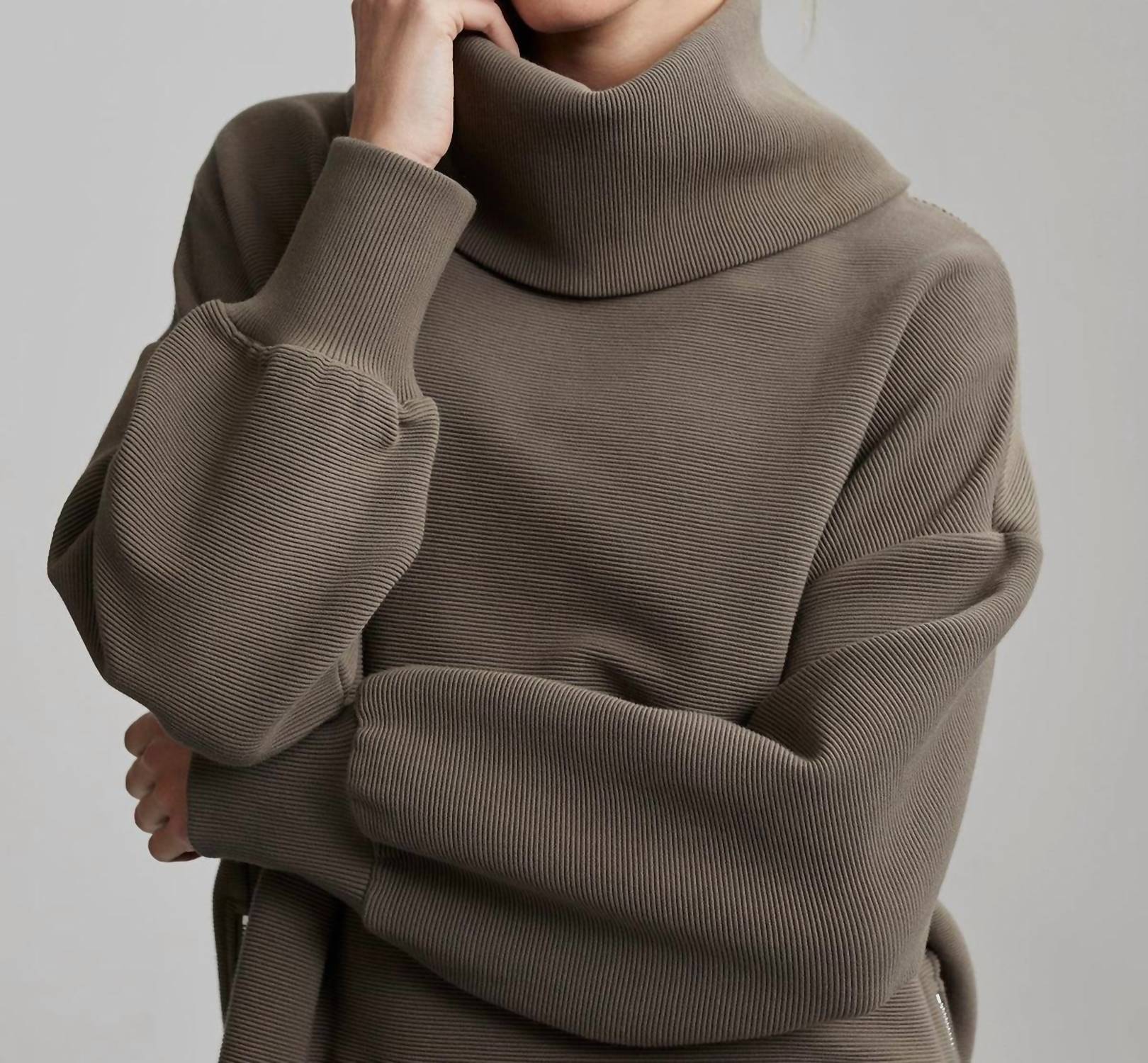 Use por baixo do seu suéter favorito ou por dentro de jeans para um visual de inverno perfeitamente elegante. Este moletom oversized apresenta mangas longas e elegantes com fole e uma gola alta larga e larga, complementada por detalhes de zíper lateral e punhos profundos para um toque ainda mais elegante. Feito com uma mistura de algodão texturizado de 53% algodão, 46% poliéster e 1% elastano para um uso confortável. Estilo pull-on. Lavagem à máquina em temperatura fria. O comprimento frontal mede 64 cm no tamanho P.