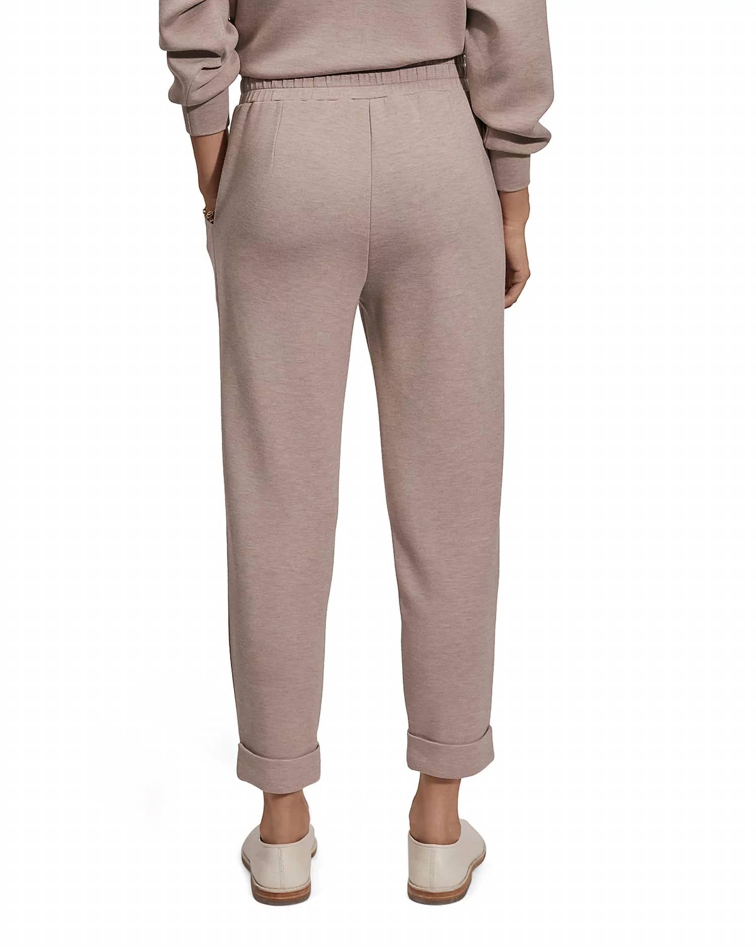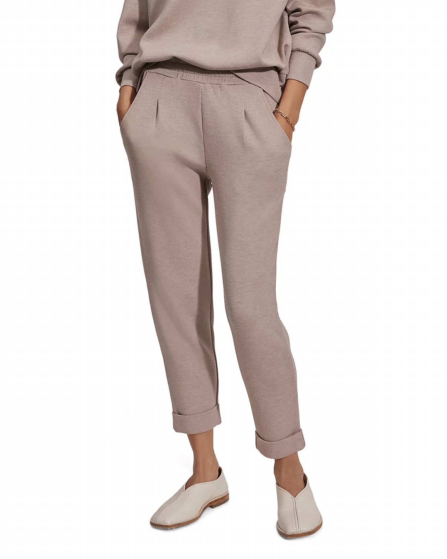 A perfectly tailored straight leg that you'll want in every color! Discover the Pull On Rolled Cuff Pants by VARLEY in elegant Taupe Marl, designed for an effortlessly chic look with a slim, tapered fit and high rise. These pants feature an 11.8" rise and a 25" inseam, accentuated by rolled cuffs, shaped pockets, and front and back waistband darts. Crafted from a blend of 81% viscose, 15% polyester, and 4% elastane, they provide comfort with a touch of stretch. Perfect for spring travel, these pants are imported and have a pull-on closure. Care for them easily with machine wash and line dry instructions. Model wears a size small (5'10" height, 33.5" bust, 23.5" waist, 34.5" hips).