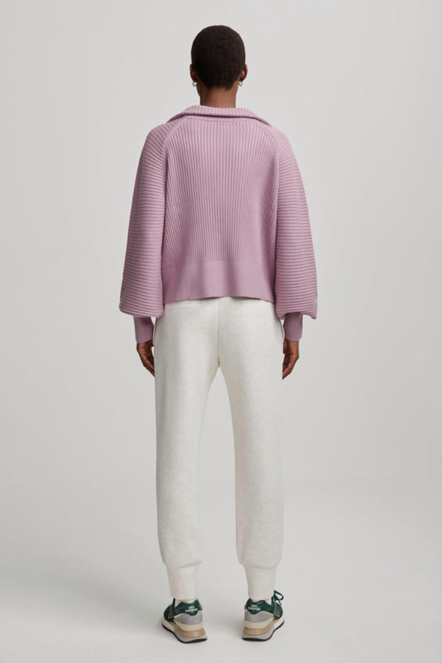 Meio zíper. Mangas bufantes e um padrão canelado direcional elevam o design. O Reid tem um corte quadrado. 44% Viscose, 28% Nylon, 28% Poliéster. Lave com cores semelhantes, feche os zíperes antes de lavar, seque na horizontal e remodele enquanto estiver úmido.