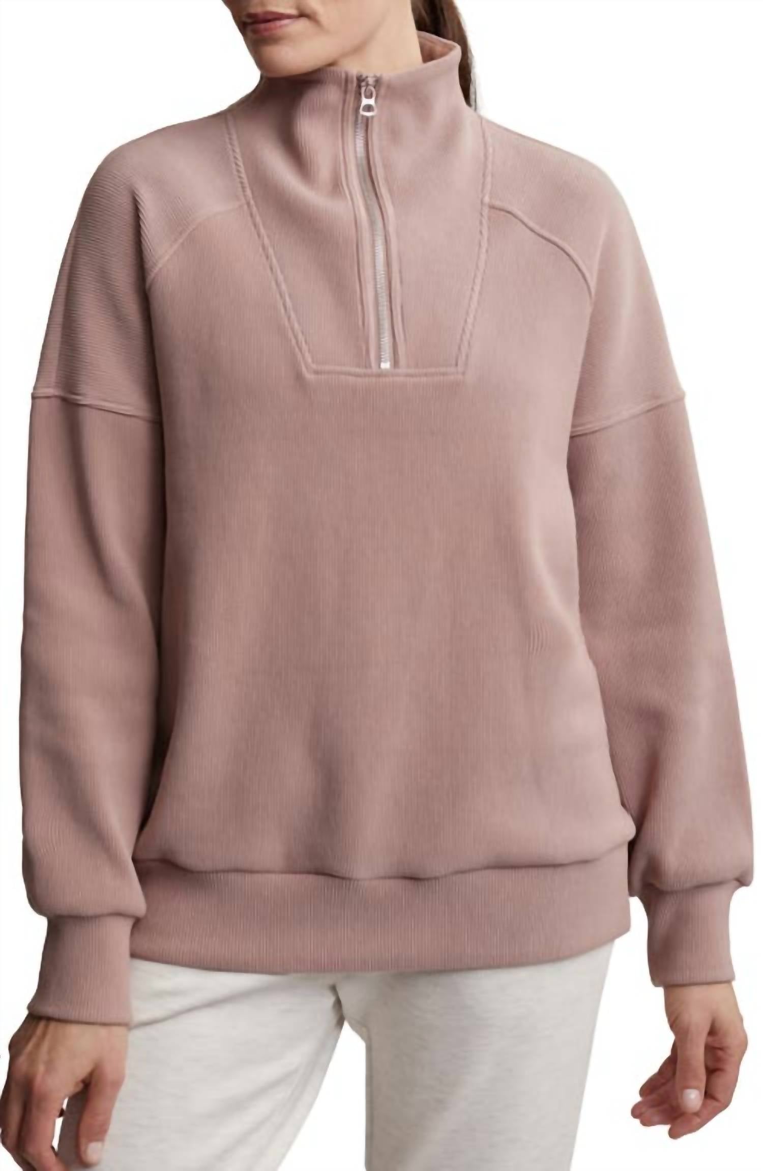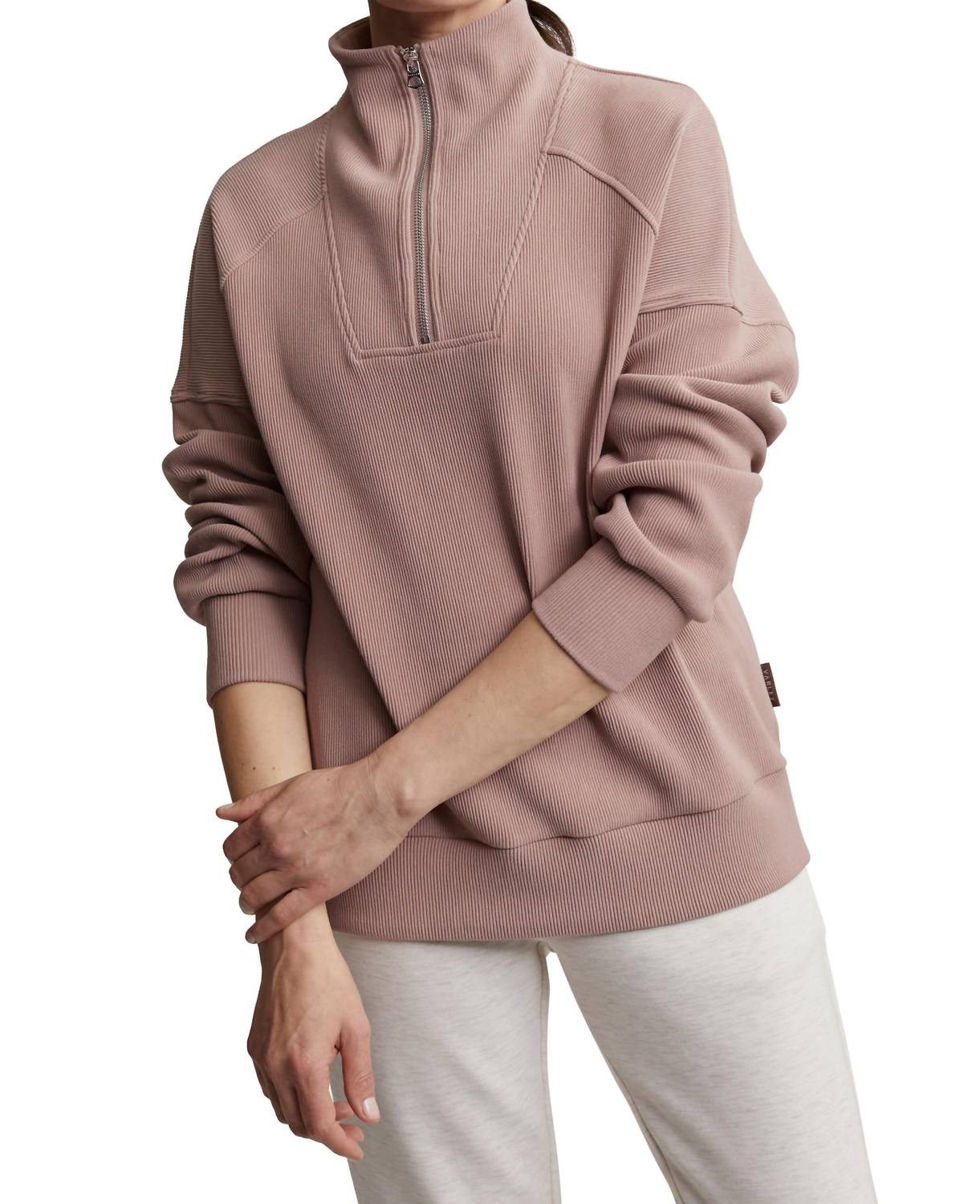 Whether you're running around town or lounging at home, this sweatshirt works for both. Elevate your wardrobe with the Rhea 1/2 Zip Sweatshirt by VARLEY, a refined twist on their bestselling Vine sweatshirt in an alluring Antler hue. This long-sleeve piece features a high mockneck collar and dropped shoulders, exuding a relaxed yet elegant silhouette perfect for spring travel or Thanksgiving gatherings. Crafted from a blend of 53% cotton, 46% polyester, and 1% elastane, it showcases signature paneled detailing and a zip closure for easy wear. Care for this streetwear staple with a simple machine wash and tumble dry.