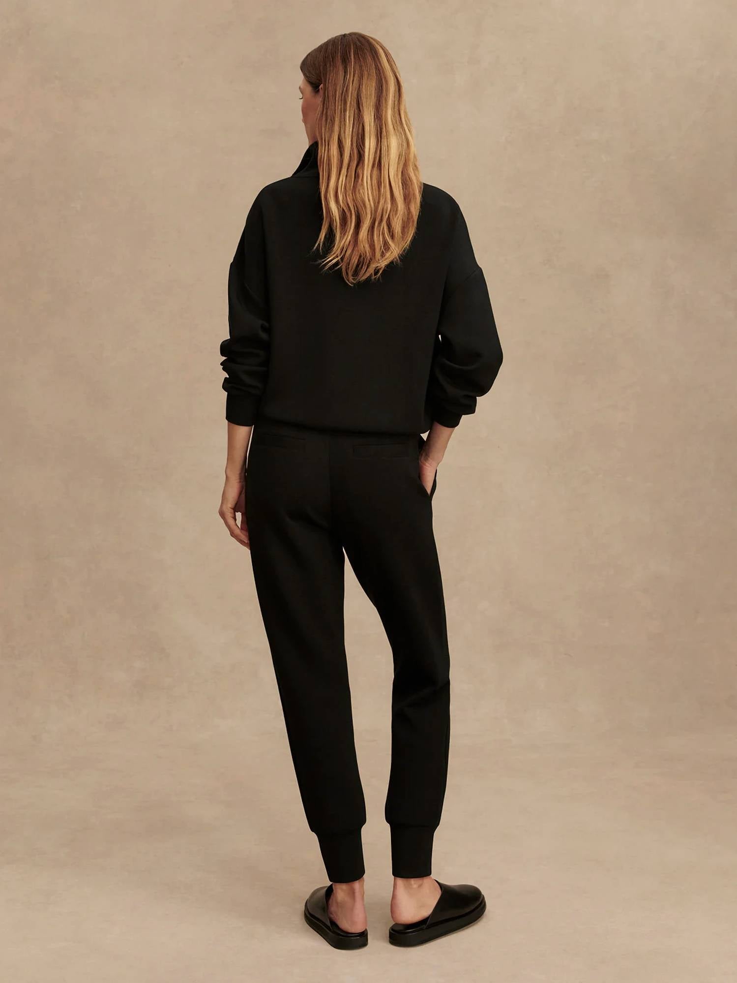 These slim-cut pants feature a clean, tailored silhouette with a cuffed hem, elastic waistband, and internal drawcord for an adjustable fit. They include side and back pockets and have a 25-inch inseam in size small. Made of 72% viscose, 23% polyester, and 5% elastane. Machine wash cool on a gentle cycle, dry flat, and cool iron if needed. Do not bleach, tumble dry, or dry clean. Turn inside out and wash with similar colors. Tie cords before washing and remove promptly from the washer.