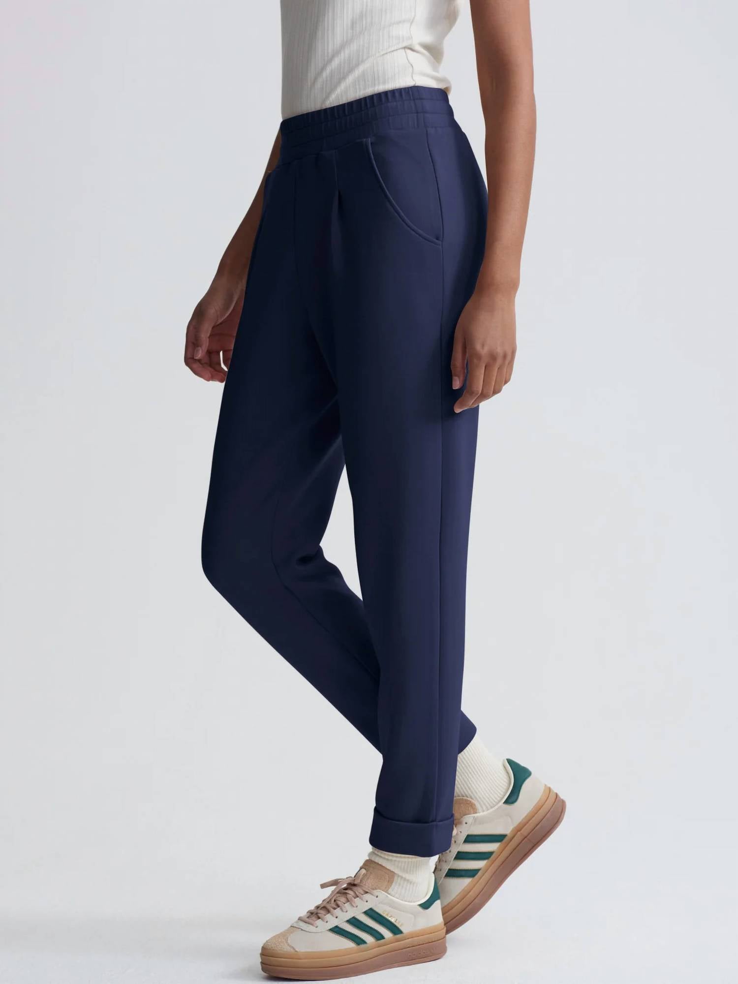 Discover the Rolled Cuff Pant 25" by VARLEY, an elegant choice in navy perfect for athleisure and fitness. Designed with a slim fit and high-rise tapered leg, these pants feature a 25" inseam and a 12" rise, along with shaped pockets and flattering front and back darts. Composed of a viscose blend—72% Viscose, 23% Polyester, and 5% Elastane—these pull-on pants effortlessly blend comfort and style. Care instructions include machine wash and lay flat to dry, ensuring easy maintenance for your active lifestyle.