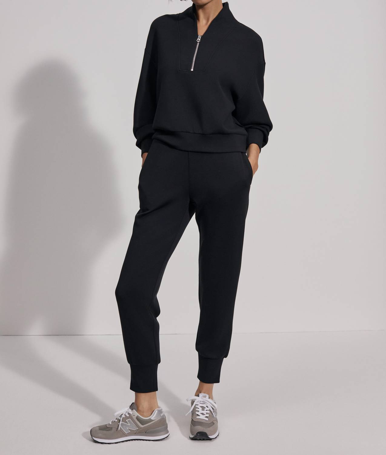 Combine-os com seus tênis favoritos para um visual descolado e descontraído. A Calça Varley Slim Cuff na cor preta clássica oferece uma opção confortável e estilosa para quem se preocupa com a moda. Confeccionada em uma mistura de viscose com estampa lisa, esta calça apresenta cintura alta, caimento relaxado e afunilado. Ela inclui cós elástico com fecho pull-on, complementado por bolsos para maior praticidade. Fácil de cuidar, com instruções de lavagem à máquina, e a costura interna mede 69 cm, perfeita para qualquer look esportivo nesta primavera. Ideal para mulheres que buscam uma mistura de fitness e estilo.