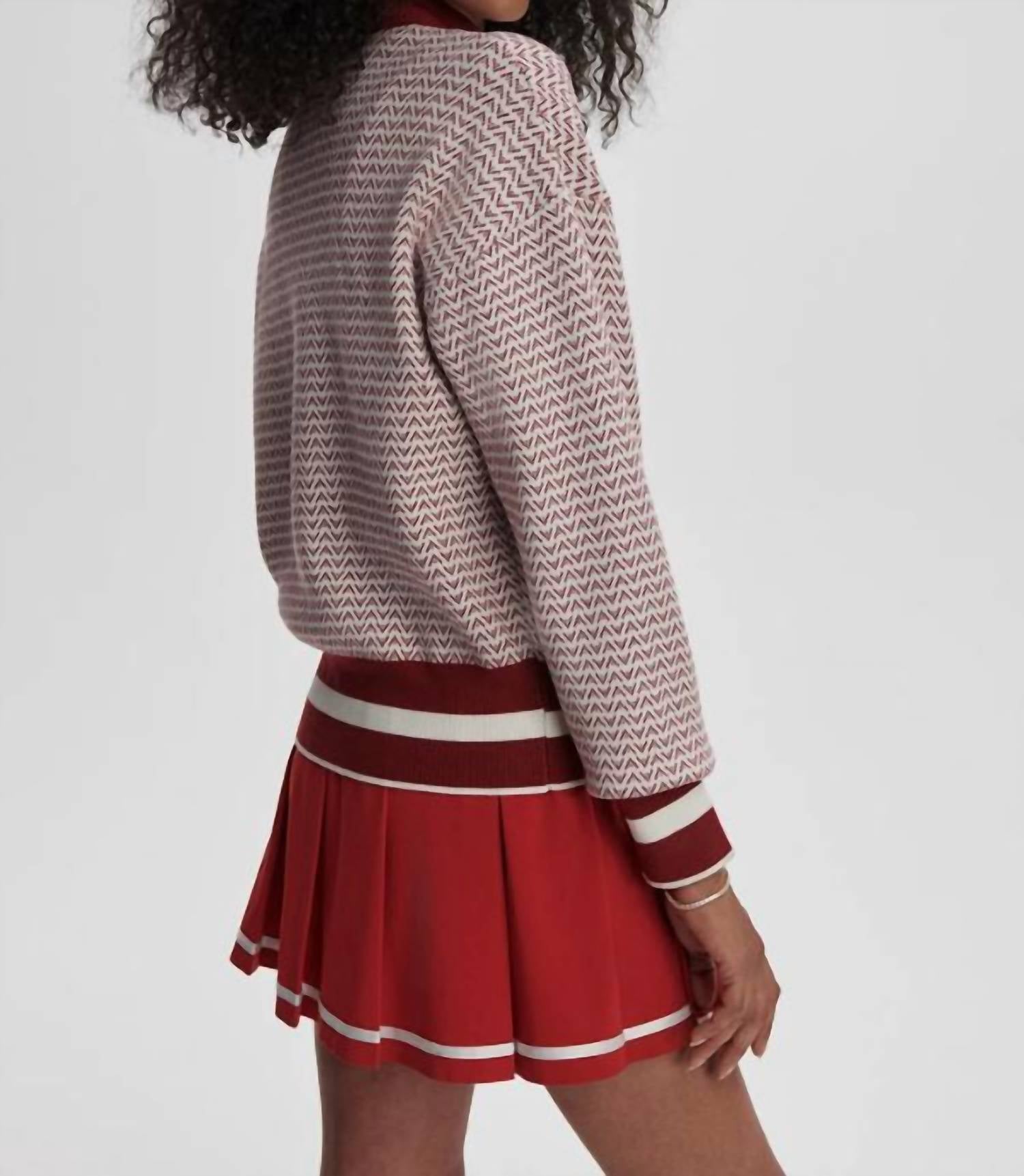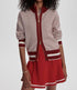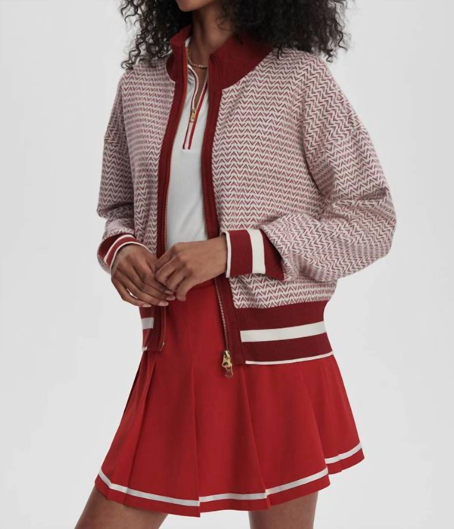The Varley Walter Knit Jacket in Red Dahlia/White is your go-to for transitioning from court to club. This women's jacket, featuring long sleeves and a textured viscose blend knit, is designed for a standard fit. It boasts a classic zip closure and eye-catching color block detailing on the hemline, collar, and cuffs. Care for your jacket by machine washing cool, laying flat to dry, and reshaping while damp. Front length for size S: 22.2".