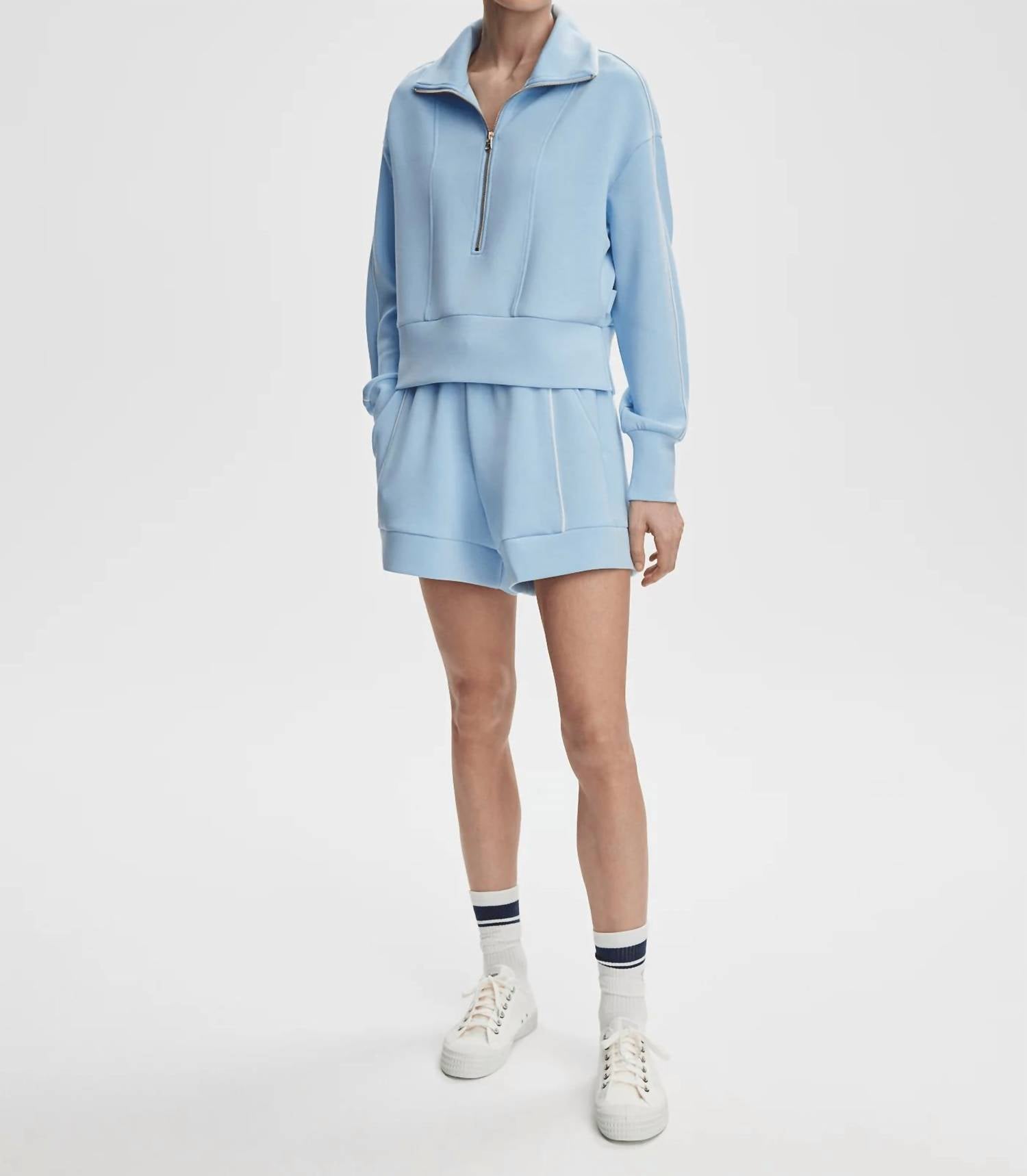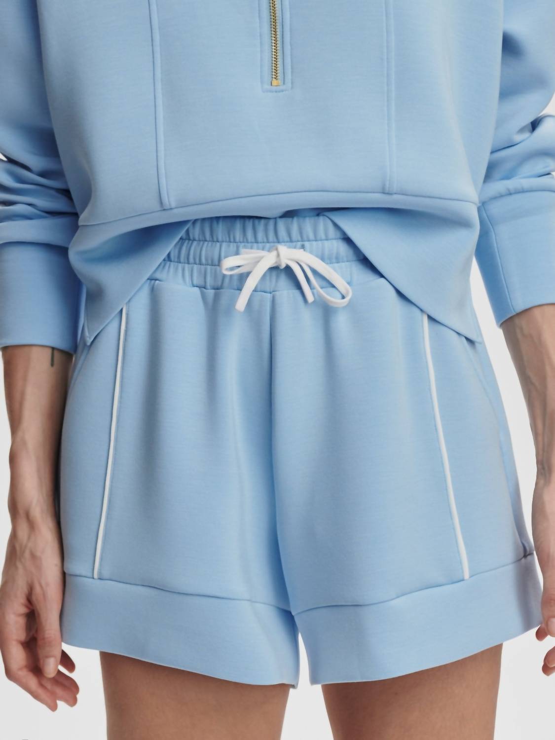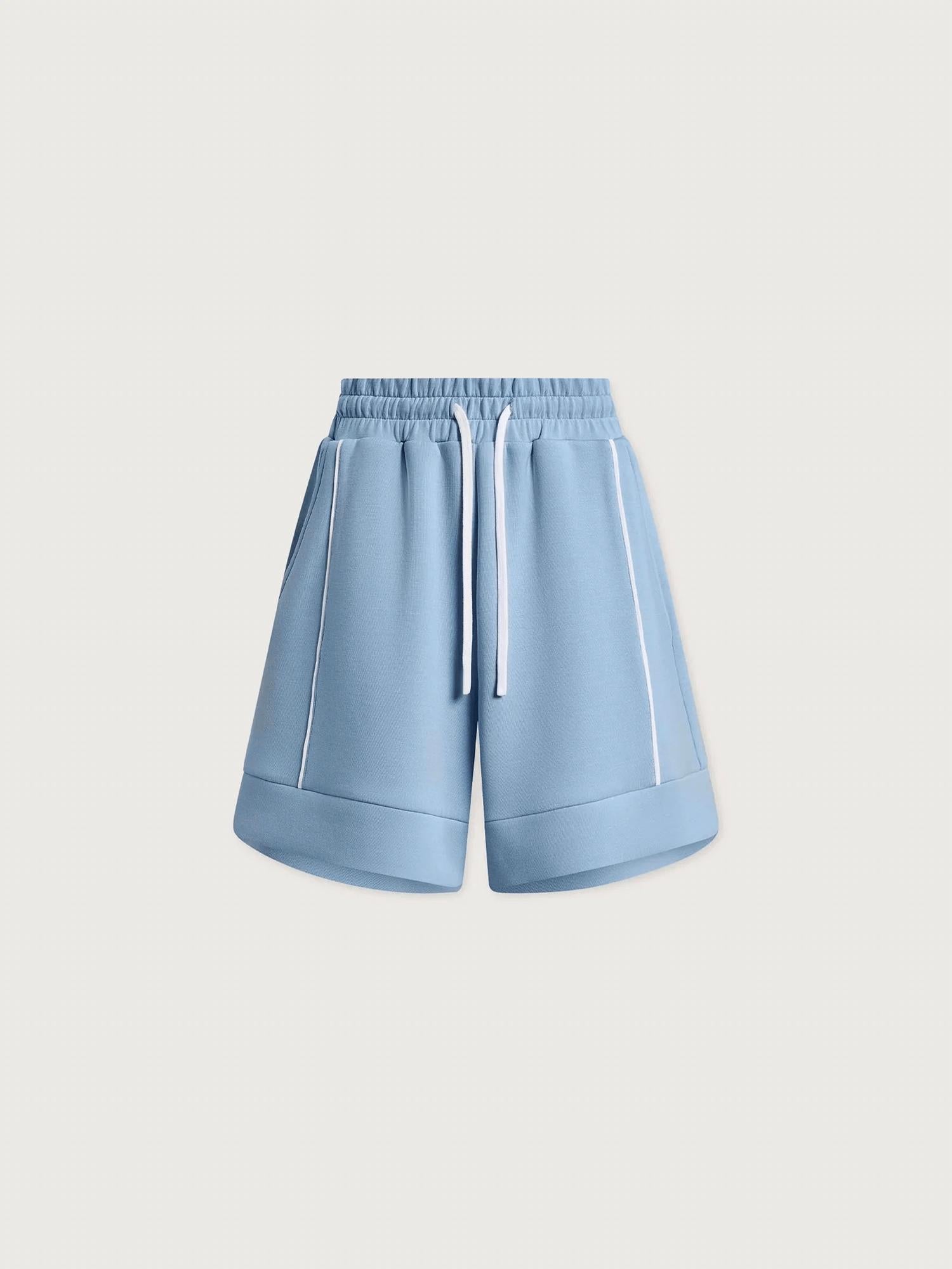 The Women's Barnes High Rise Short by VARLEY is designed for supreme comfort and style in a vibrant Airy Blue. Made from a blend of 81% Viscose, 15% Polyester, and 4% Elastane, these minimalist high-rise shorts offer a cool feel with added piping texture. They feature practical pockets and a secure tie closure. Care for these vacation-ready shorts is easy with machine wash instructions; lay flat to dry.