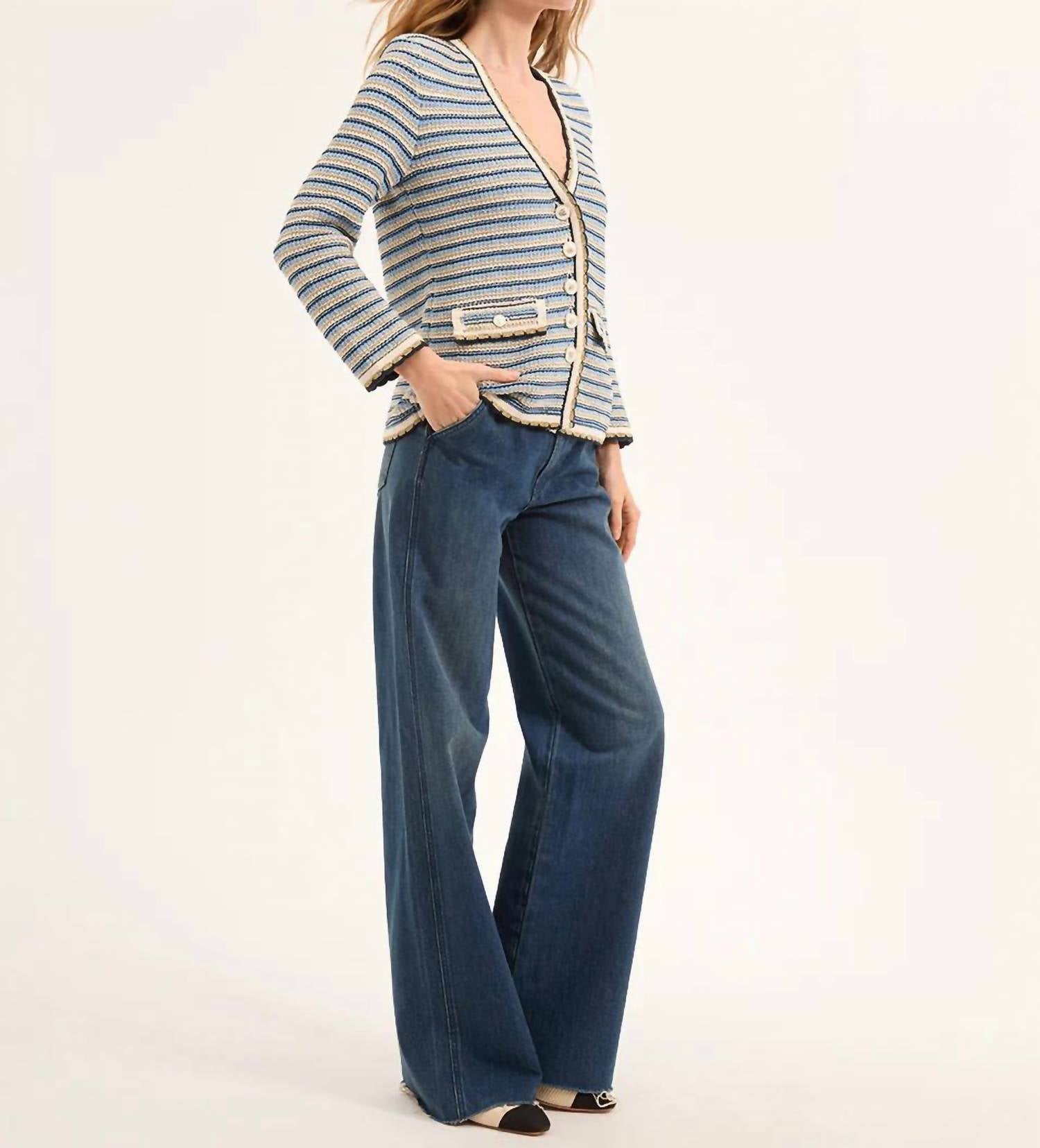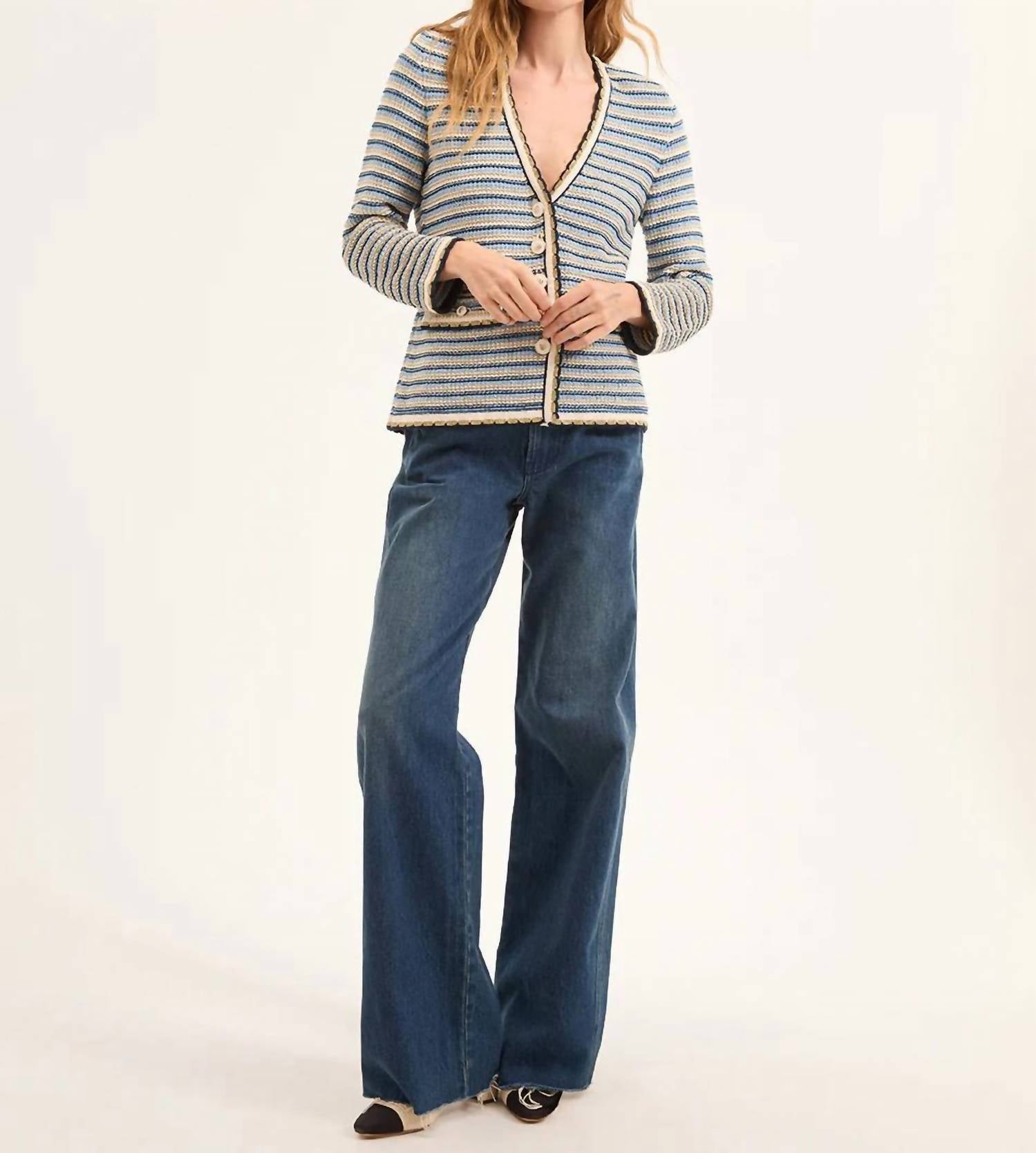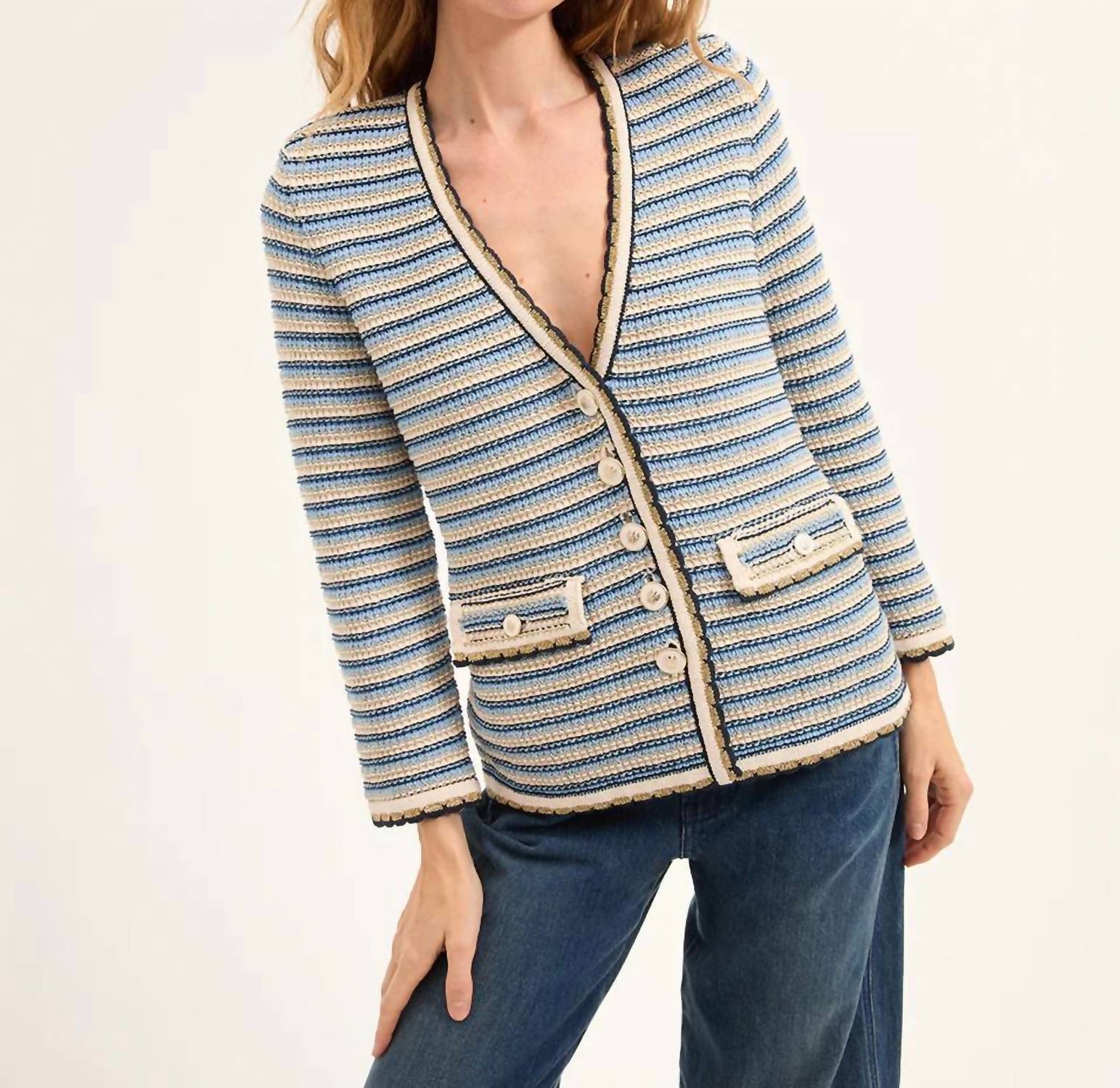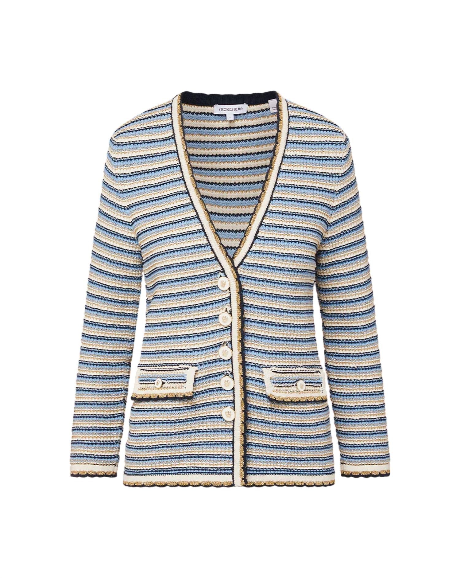 Este cardigan será um favorito para usar em rodízio de suéteres. Descubra a Jaqueta Ceriani Knit da Veronica Beard, que oferece a praticidade de um cardigã com o requinte de uma jaqueta. Esta maravilha italiana é confeccionada em mistura de algodão, com mangas longas, decote em V profundo e silhueta alongada com listras multicoloridas em azul-marinho. Com bolsos com aba e botões esmaltados, garante estilo e funcionalidade. Composição: 78% algodão, 22% poliamida. Fechamento: Botão. Cuidados: Lavagem a seco.