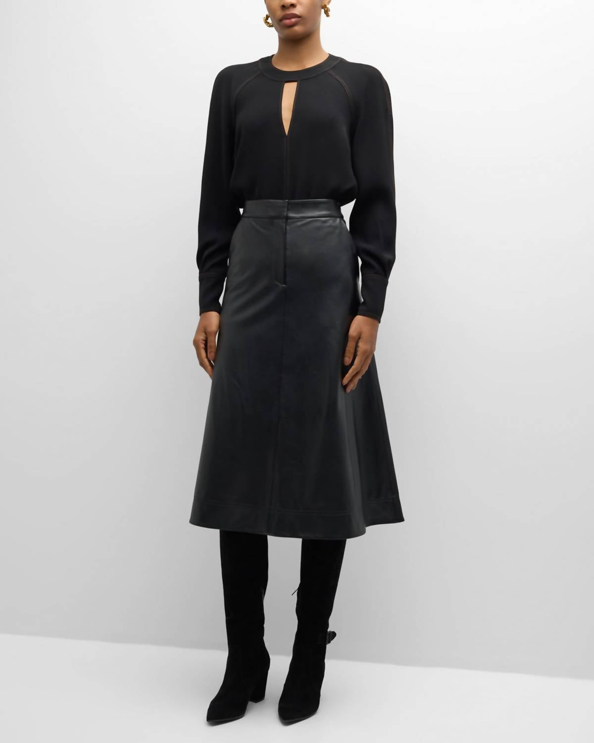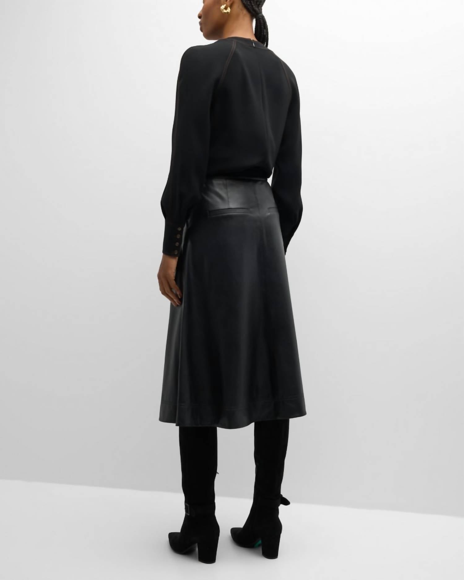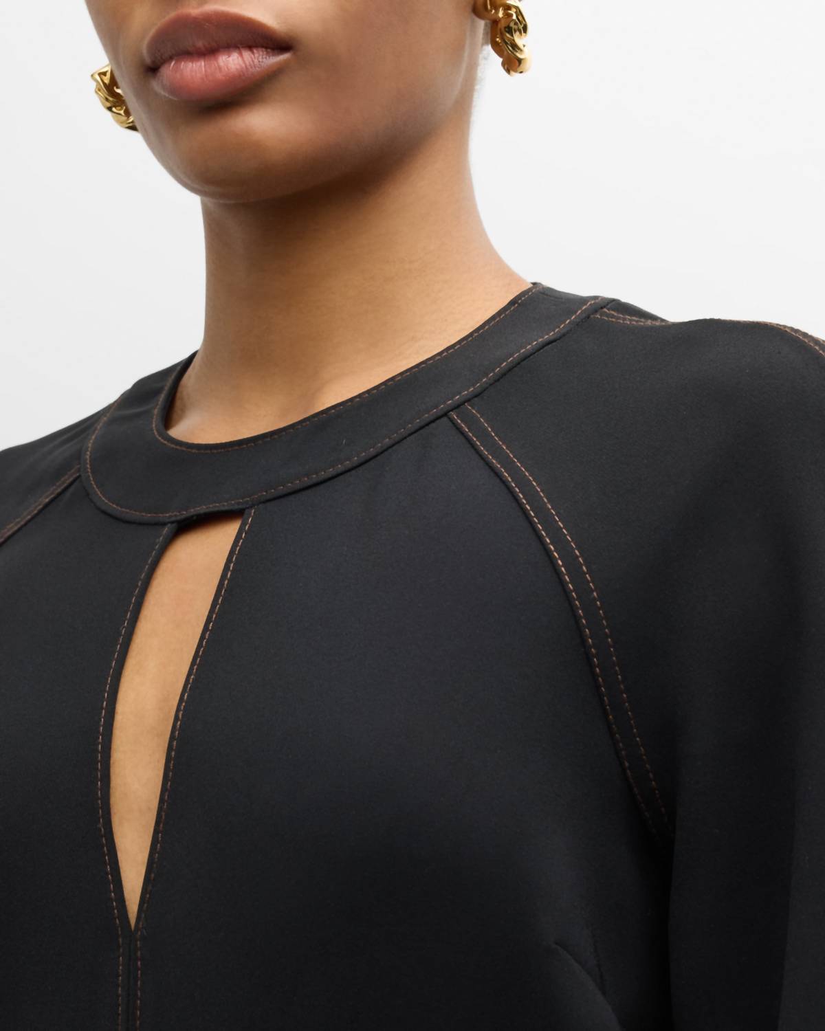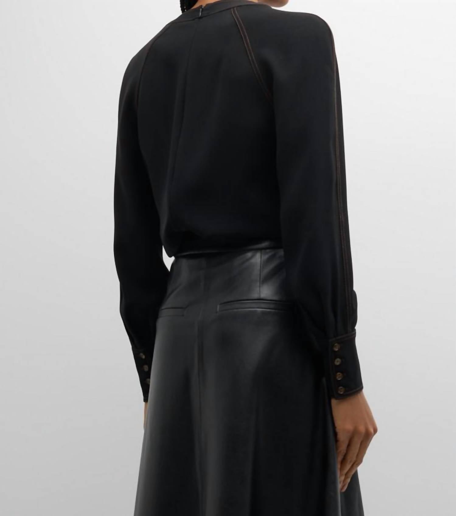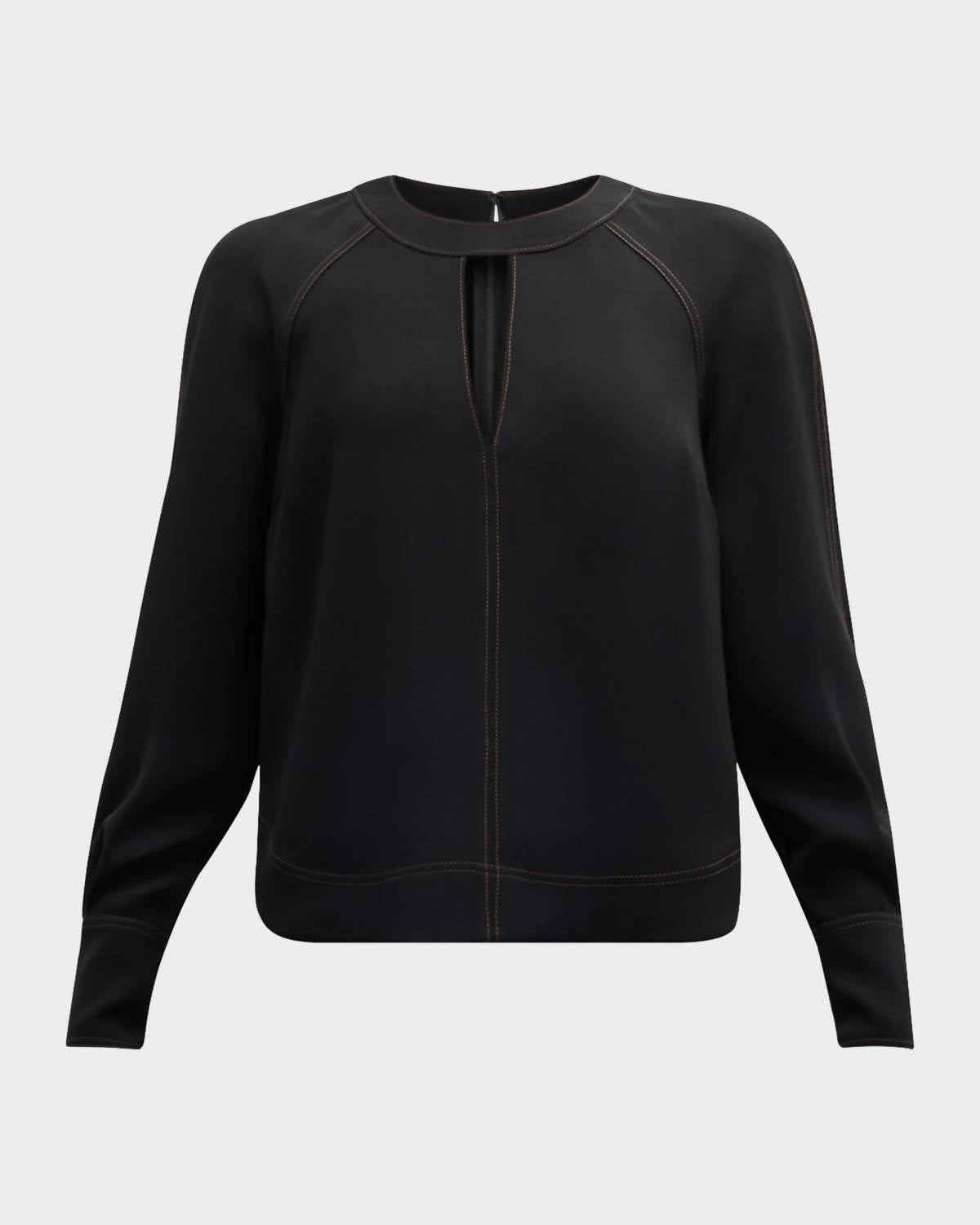 Uma blusa de manga comprida que você pode usar com jeans, saias, bem... quase tudo! Apresentamos a Tena Top da Veronica Beard, uma adição chique ao seu guarda-roupa com seu elegante acabamento preto. Esta camiseta de manga comprida lisa apresenta pespontos contrastantes, gola redonda recortada e punhos abotoados para um visual elegante. Confeccionada com caimento justo, ela também inclui um prático fecho de zíper invisível nas costas, projetado para se ajustar ao quadril. Cuide bem desta peça estilosa optando pela lavagem a seco.