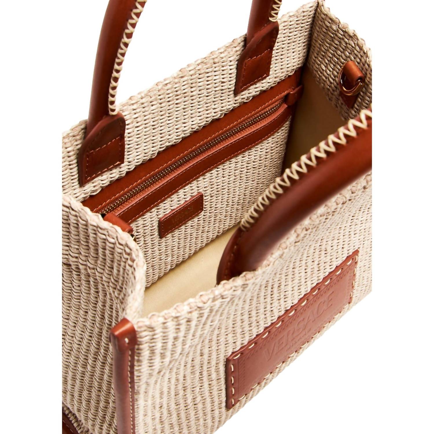 Experience the refined elegance of the Versace Women's Athena Raffia Leather Small Shopper Tote Bag, crafted meticulously in Italy. This exquisite accessory seamlessly pairs beige raffia with smooth brown leather trim and features gold tone hardware. Enjoy versatile carrying options with double leather top handles and a detachable beige canvas shoulder strap, boasting a maximum strap drop of 25 inches and a handle drop of 4.5 inches. Designed with a spacious interior and an interior zipper pocket, this tote is perfect for carrying your essentials in style, measuring 11" x 4" x 9" (LWH).