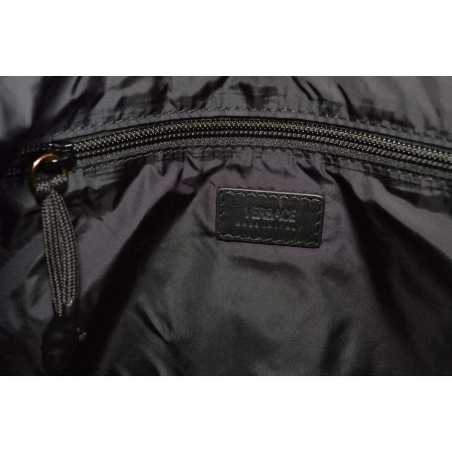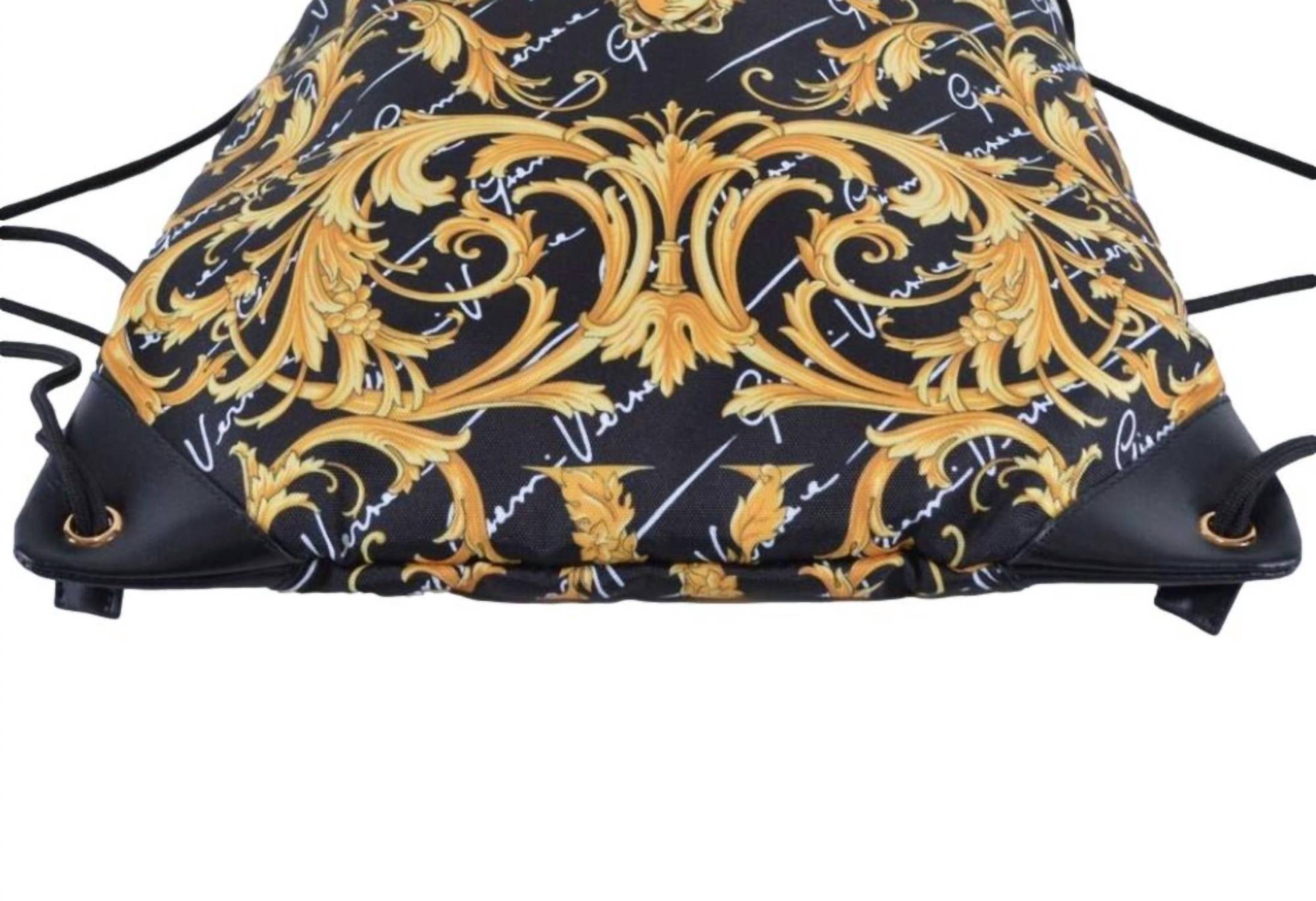 Elevate your style with the Women's Nylon Barocco Signature Print Drawstring Backpack by Versace, featuring a luxurious gold Baroque print on black nylon. This Italian-made accessory showcases the iconic "La Medusa" head logo for a touch of elegance. Equipped with a practical drawstring closure, this backpack includes a black nylon interior lining with a zip pocket and a spacious main compartment. Measuring 14" x 6" x 15", and with double flat top handles with a 3.5" drop, it combines functionality with chic design, complete with Versace dust bag and authenticity cards.