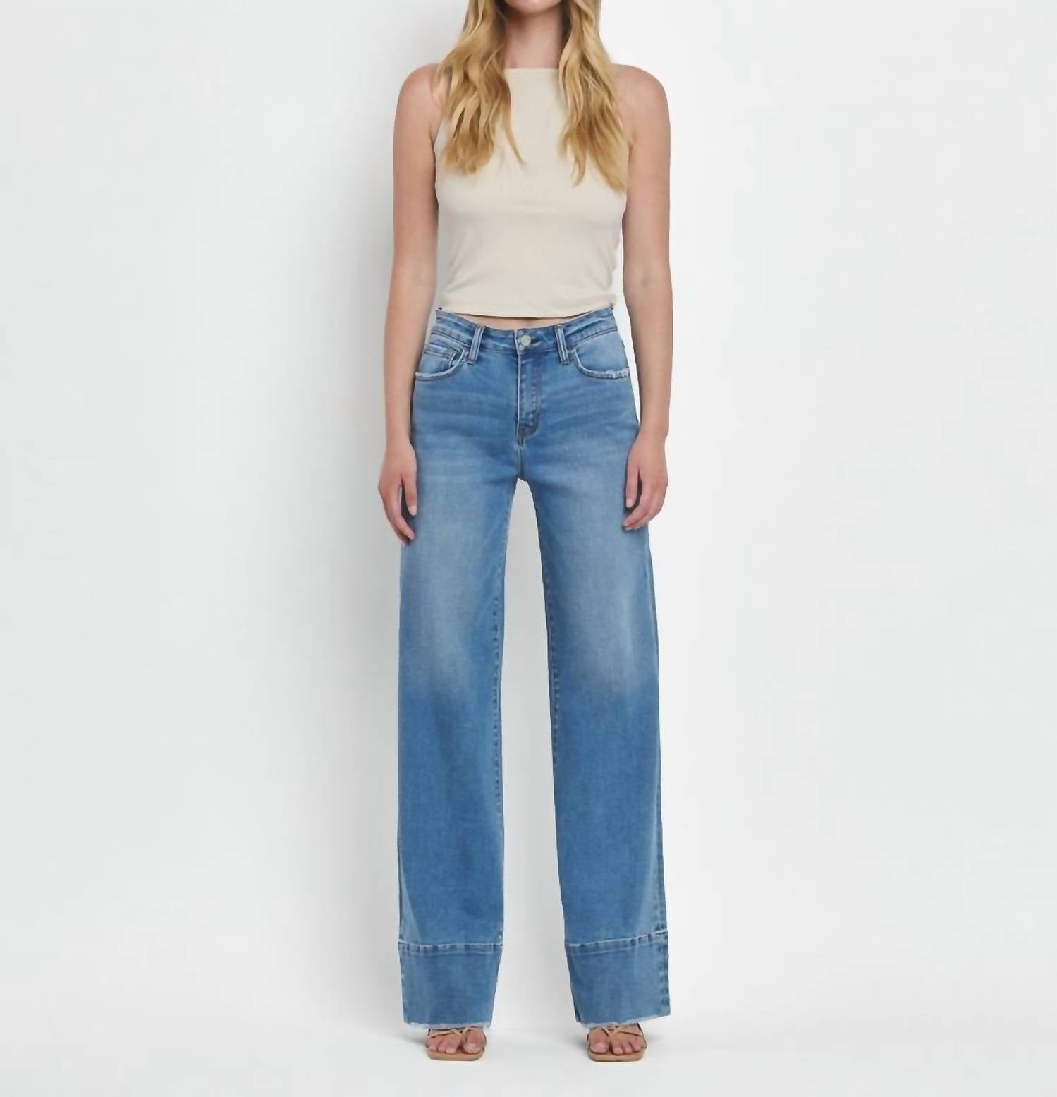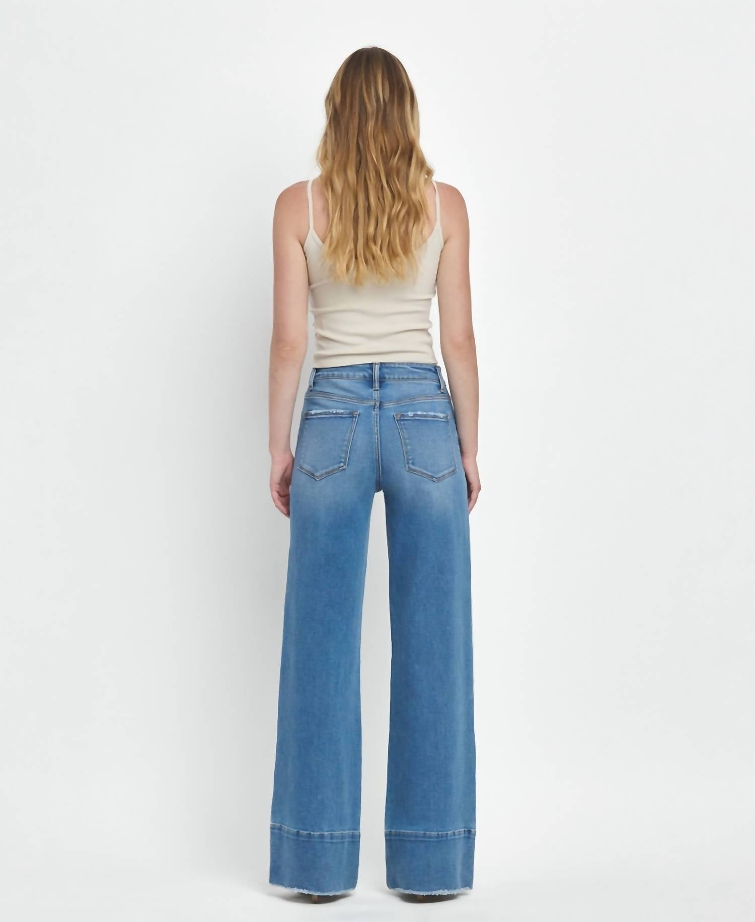 Combine esta calça jeans de perna larga com mules, slides ou suas sandálias de tiras favoritas. Apresentamos a Calça Jeans High Rise Raw Hem Wide A Line da VERVET BY FLYING MONKEY, um jeans estiloso e essencial para o seu guarda-roupa. Esta calça jeans larga e evasê vem com um ajuste confortável e comprimento total, cintura alta e bainha crua, medindo 26 cm de altura frontal, 86 cm de costura interna e 54 cm de abertura nas pernas. Confeccionada em uma mistura de 65% algodão, 30% poliéster, 3% rayon e 2% elastano, ela oferece elasticidade confortável. O fechamento é feito com zíper e esta calça jeans pode ser lavada na máquina para maior praticidade. Fabricada na China, ela foi projetada para atender à mulher moderna que busca estilo e conforto. A modelo tem 1,78 m e veste tamanho 26.