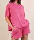 The Oversized Two Tone Double Knit Top & Shorts by VERY J, available in a soothing hue, is the perfect loungewear set for your next vacation. This chic Y2k-inspired set features a top with short sleeves, a crewneck, and a buttoned back, complete with a patch pocket and a round hi-lo hem. The shorts boast a comfortable elastic high waist with a drawstring and convenient side pockets. Crafted with 80% Polyester and 10% Rayon, this textured set is thoughtfully designed for easy care: machine wash cold and line dry. Model height: 5'8", wearing a size Small.
