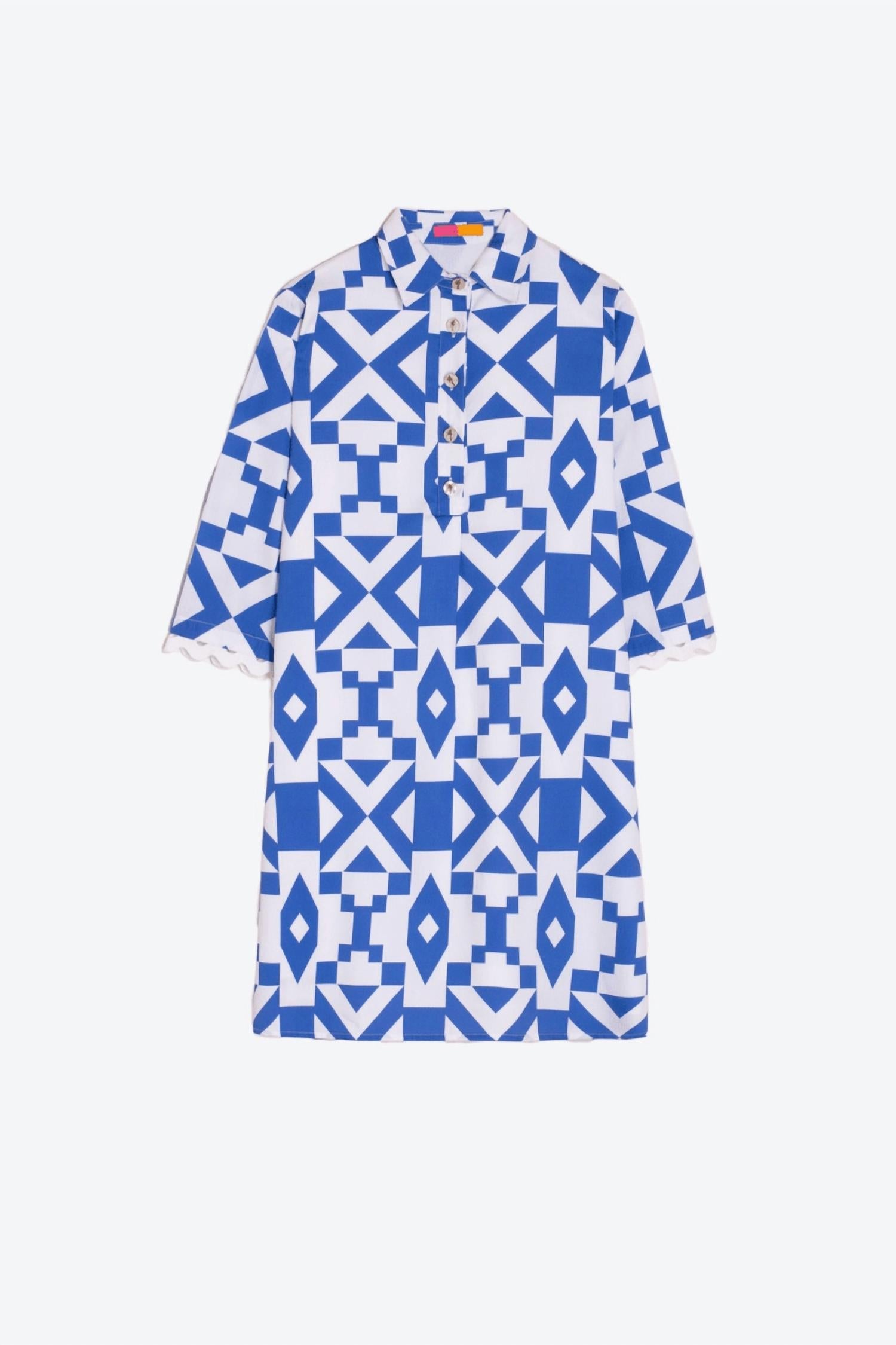 O minivestido perfeito para os meses mais quentes. Apresentamos o Vestido Mini Tyanna da Vilagallo, perfeito para elevar seu estilo em qualquer jantar. Com mangas três quartos e confeccionado em 100% algodão, este vestido-camisa apresenta uma estampa geométrica marcante em azul e branco. Possui gola clássica adornada com botões decorativos de palmeira, adicionando um toque de elegância, e fecho de botão para facilitar o uso. Esta peça personifica o luxo discreto, tornando-a a escolha perfeita para um conjunto sofisticado de primavera. Cuidados: Lavar à máquina.