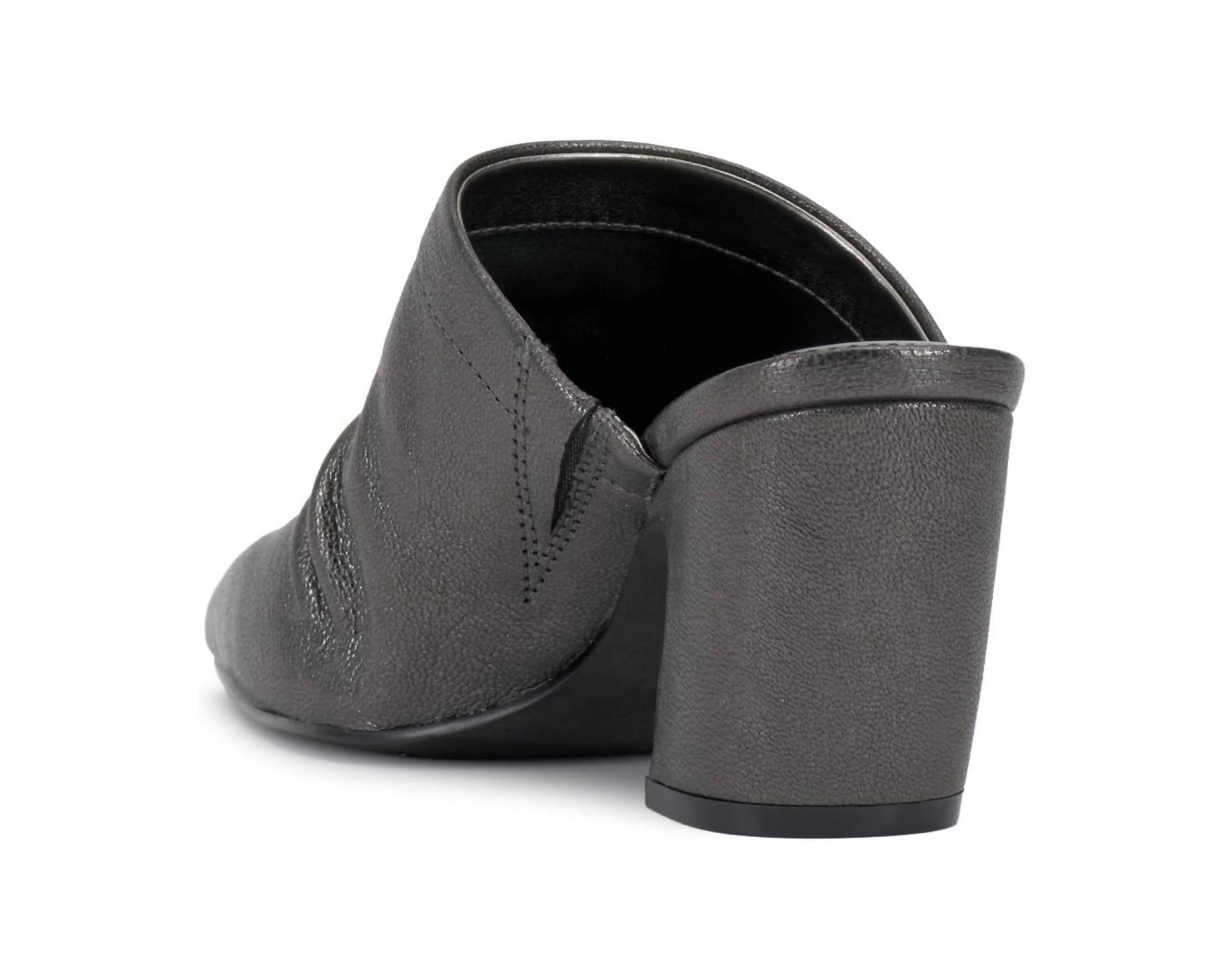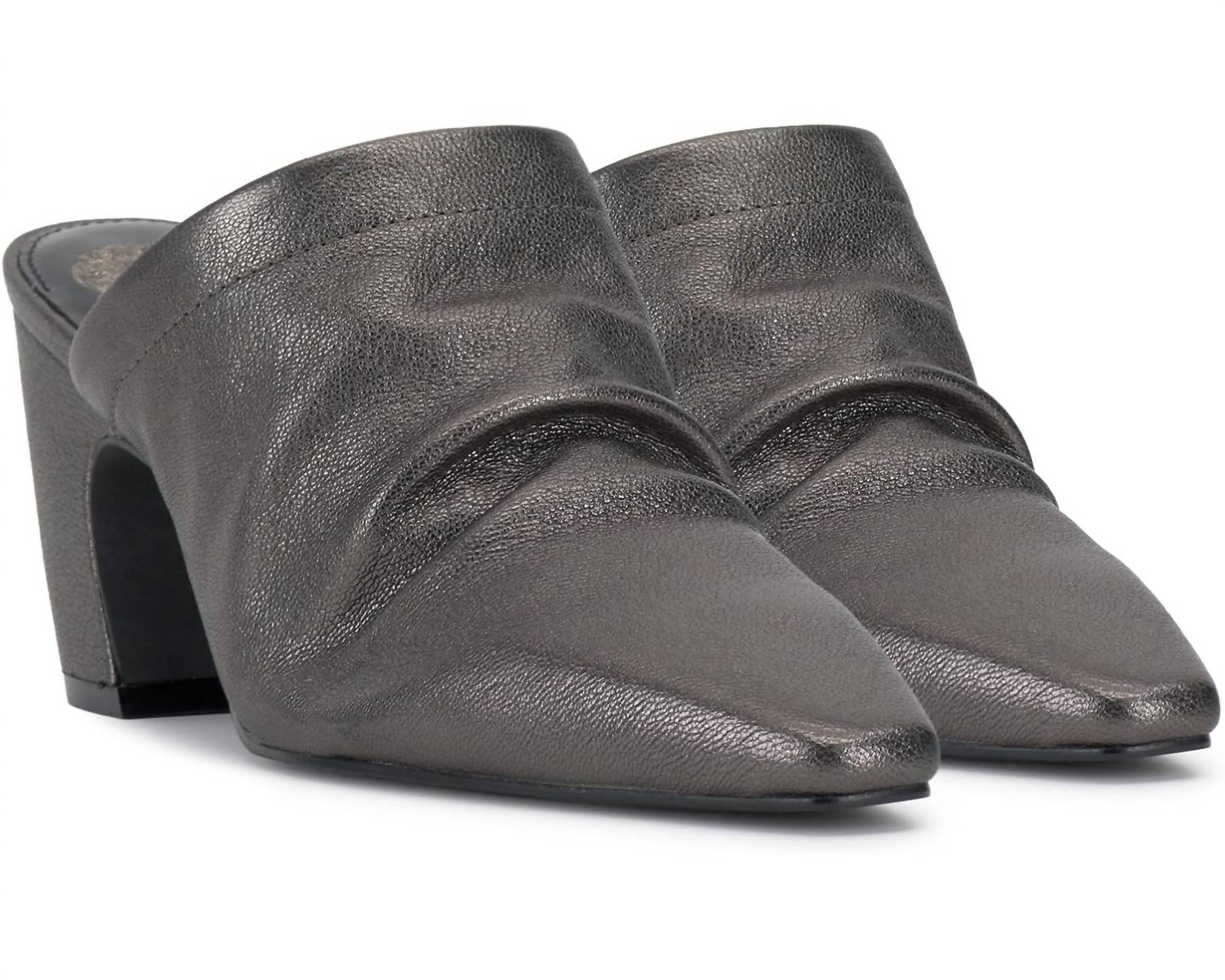Experience elegance with the Women's Carlie Mule by Vince Camuto, featuring a snip toe design in dark pewter. This slip-on mule boasts a 2.75-inch block heel for a chic lift, with an unlined leather upper providing natural ruching on the foot. For ultimate comfort, it includes a rubber outsole, padded sock, and an elastic gore enhancing the fit, complemented by a polyester lining and cushioned faux leather insole. Ideal for women seeking sophisticated style with comfort in a pointed toe design.
