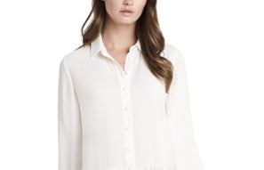 Vince Camuto transforma uma blusa clássica de botões em uma túnica moderna e estilosa. O estilo peplum na cintura com detalhes elegantes de renda faz desta uma blusa essencial nesta temporada.