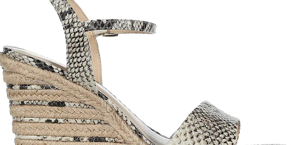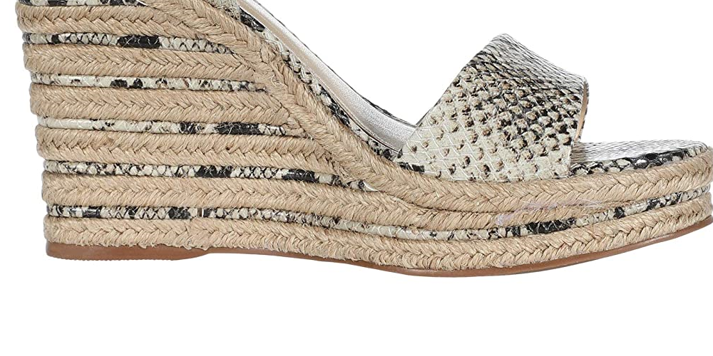 Sandálias femininas Vince Camuto Marybell de couro com tira no tornozelo e salto anabela, pretas e brancas, tamanho 10