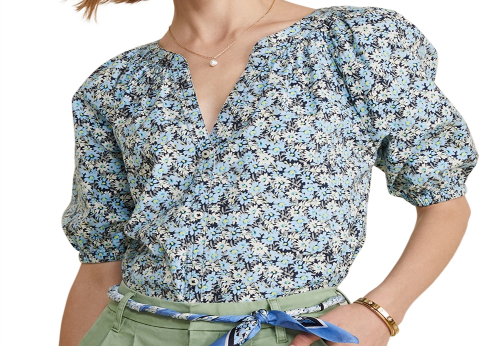Blusa Vineyard Vines com manga bufante e botões na frente | Cor: Azul marinho floral | Tamanho: M | Material: 98% algodão/2% elastano | Blusas