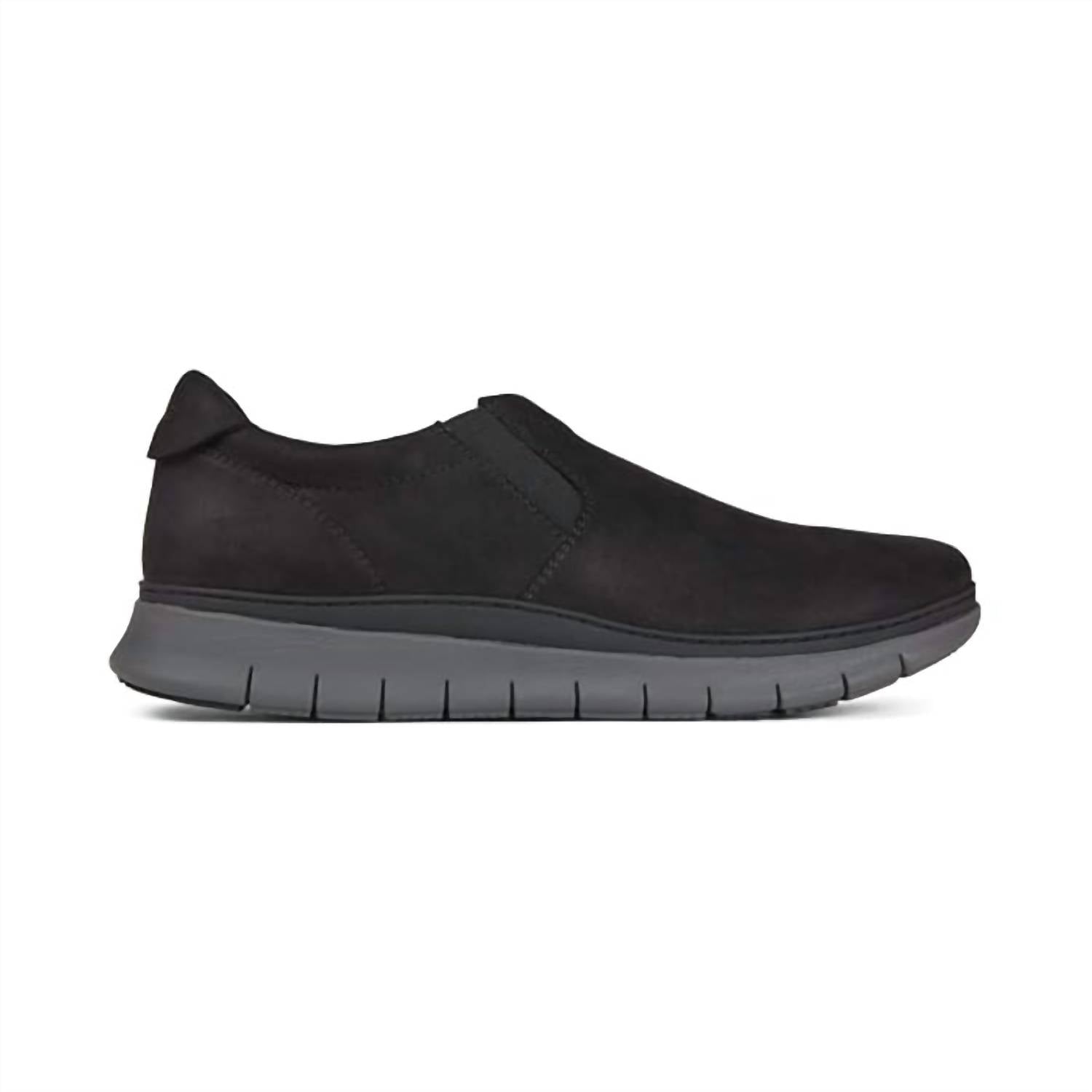 Experience the blend of comfort and style with the Men's KHAI Nubuck Slip On Shoes by VIONIC. Crafted with a nubuck upper and dual goring, these loafers offer maximum flexibility. Enjoy soft textile linings and a textile-covered EVA footbed designed for all-day comfort. The lightweight and flexible rubber outsole complements the flat heel height of 1 inch, making these black slip-ons an ideal choice for versatile wear.