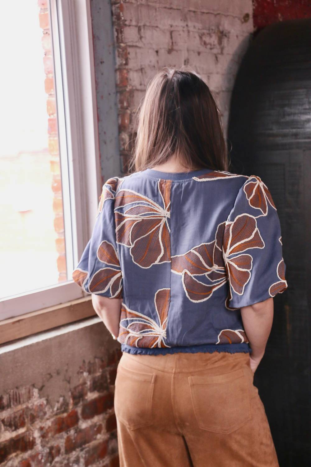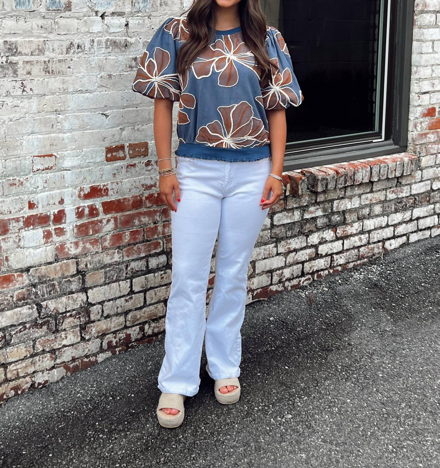 Look no further, you just found your perfect tee! The Fae Contrast Band Detailed Floral Embroidery Top by VOY combines classic boho chic with springtime elegance. This navy blue top features a charming floral pattern and short, fashionable puff sleeves, ideal for a dinner party or Easter gathering. Made with a soft elastic hem and neckline, it's a pull-on piece that effortlessly blends comfort and style. The model, standing at 5'8", is wearing a size small.