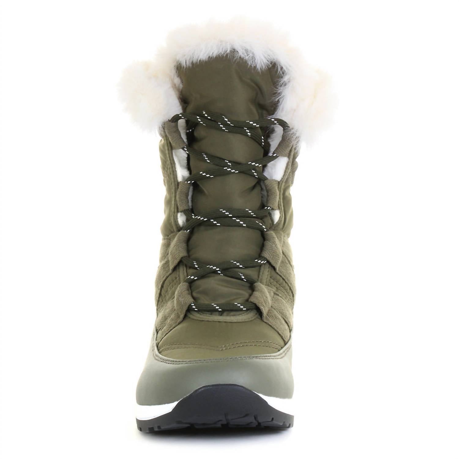 Step into the chill with the Women's Chery Waterproof Boots by Wanderlust, a khaki-toned essential for winter layering. Crafted from faux leather with a flat heel, these boots boast a waterproof design and feature a soft plush collar to lock in warmth. Suitable for temperatures as low as -40 degrees, they incorporate 3M Thinsulate® insulation, Warmtex® sock lining, and a TPR weather-resistant outsole. These vegan-friendly boots, available in women's sizes 6-11, are perfect for Thanksgiving travels with their easy slip-on lace-up style and wide fit for more comfort.