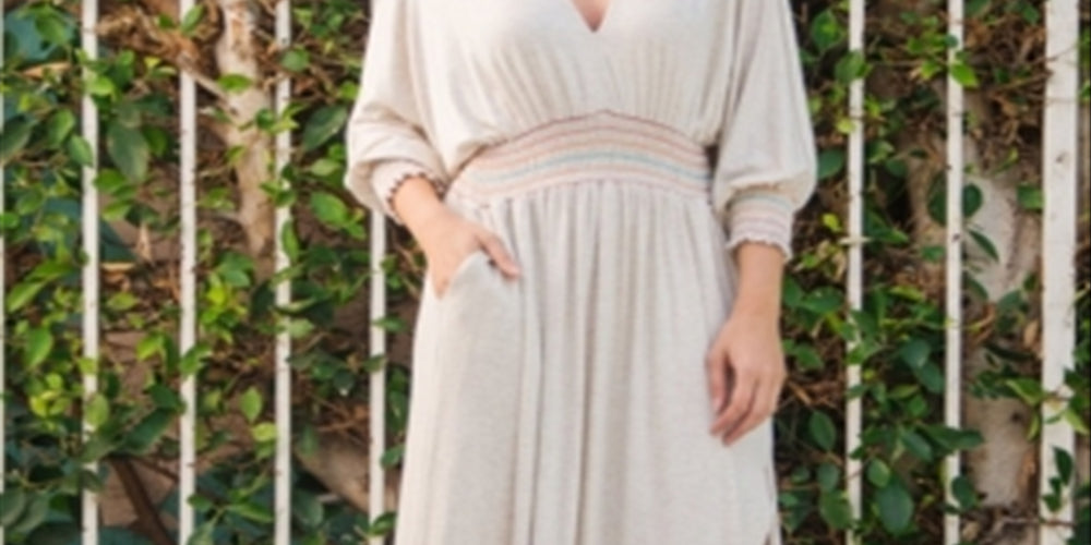 Este vestido longo de manga comprida tem decote em V e fenda lateral. O design apresenta detalhes franzidos sob o busto e nos punhos das mangas com costuras contrastantes em arco-íris.