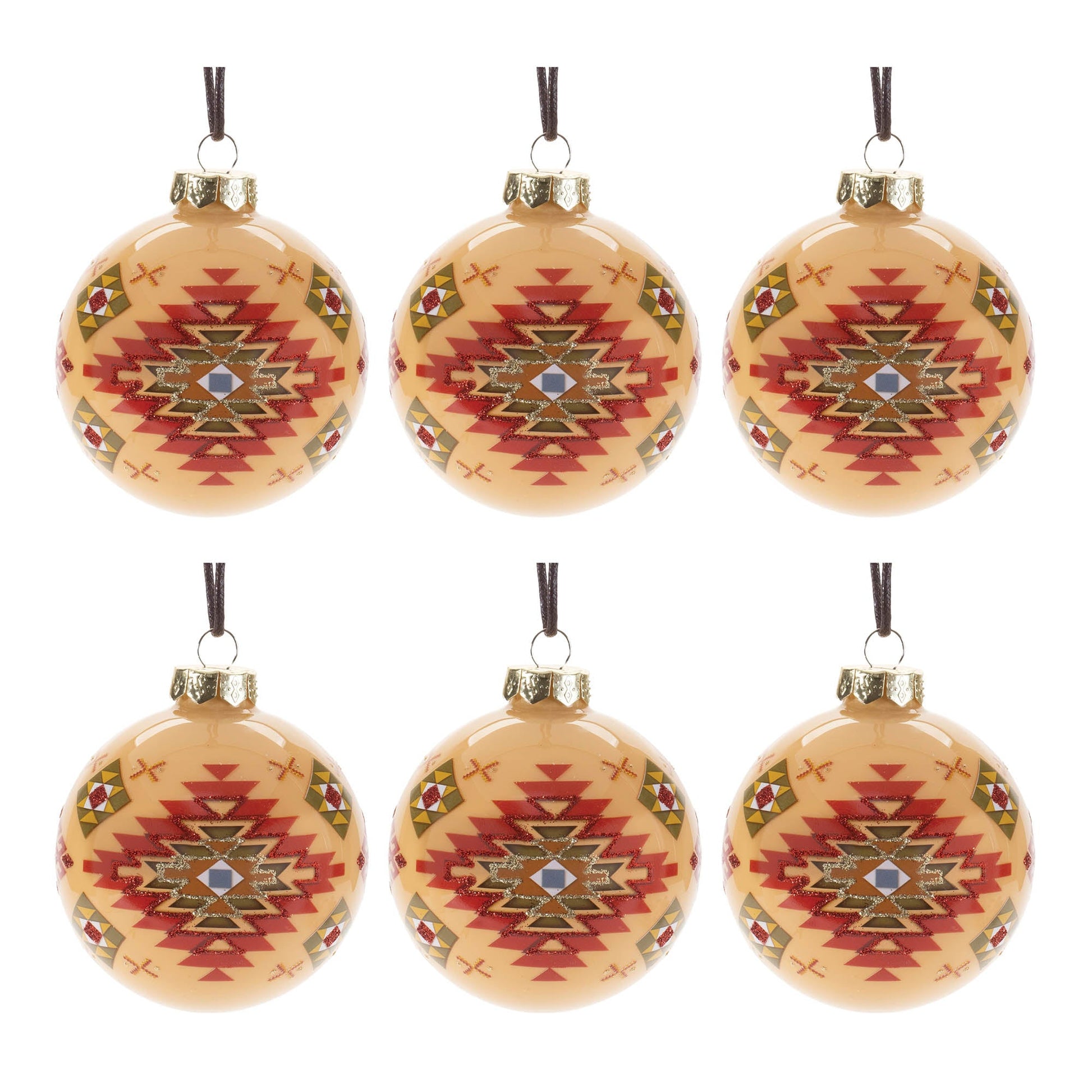 Bring the warmth of the West into your holiday decor with the Western Glass Ball Ornament. Featuring festive red and green tones, these traditional ball-shaped ornaments are beautifully adorned with rustic Western Aztec patterns and a touch of glitter for a bit of sparkle. The delicate braided cord hanger and gold ornament cap add an elegant finishing touch to these unique ornaments. Sold in a set of 6 matching pieces, these ornaments are perfect for adding a rustic, Western flair to your Christmas tree or as a thoughtful gift for loved ones who appreciate the beauty of the West.