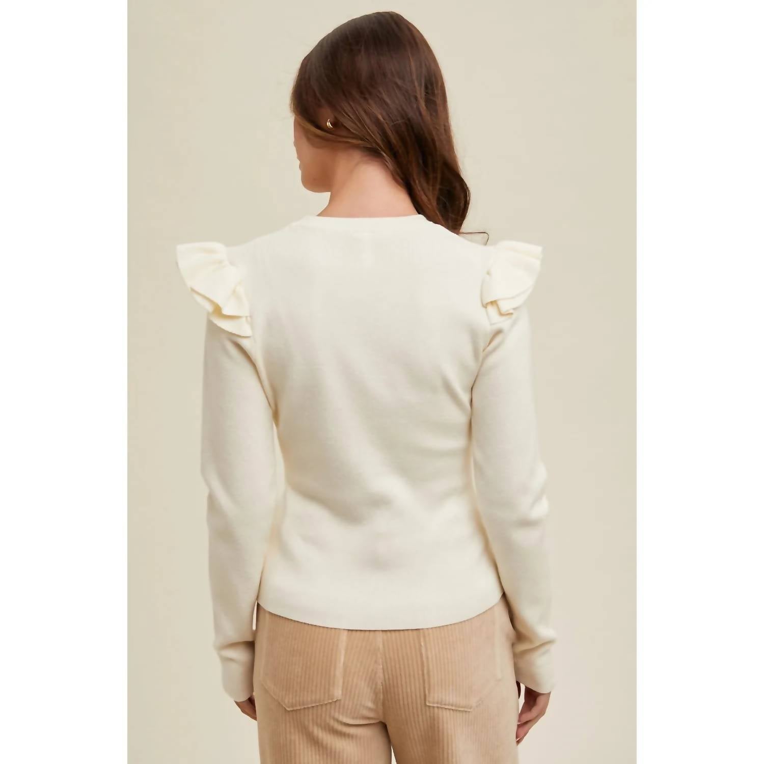 Enhance your wardrobe with the Georgette Top by WISHLIST, crafted to blend comfort with minimalist elegance. This cream sweater features long, ruffled sleeves and a crewneck, perfect for a dressed-down yet sophisticated look. Made from a viscose blend, it offers a soft feel with 50% viscose, 28% polyester, and 22% nylon. Closure: Pull on. Care: Hand wash and line dry. Ideal for fall travel and Thanksgiving gatherings.