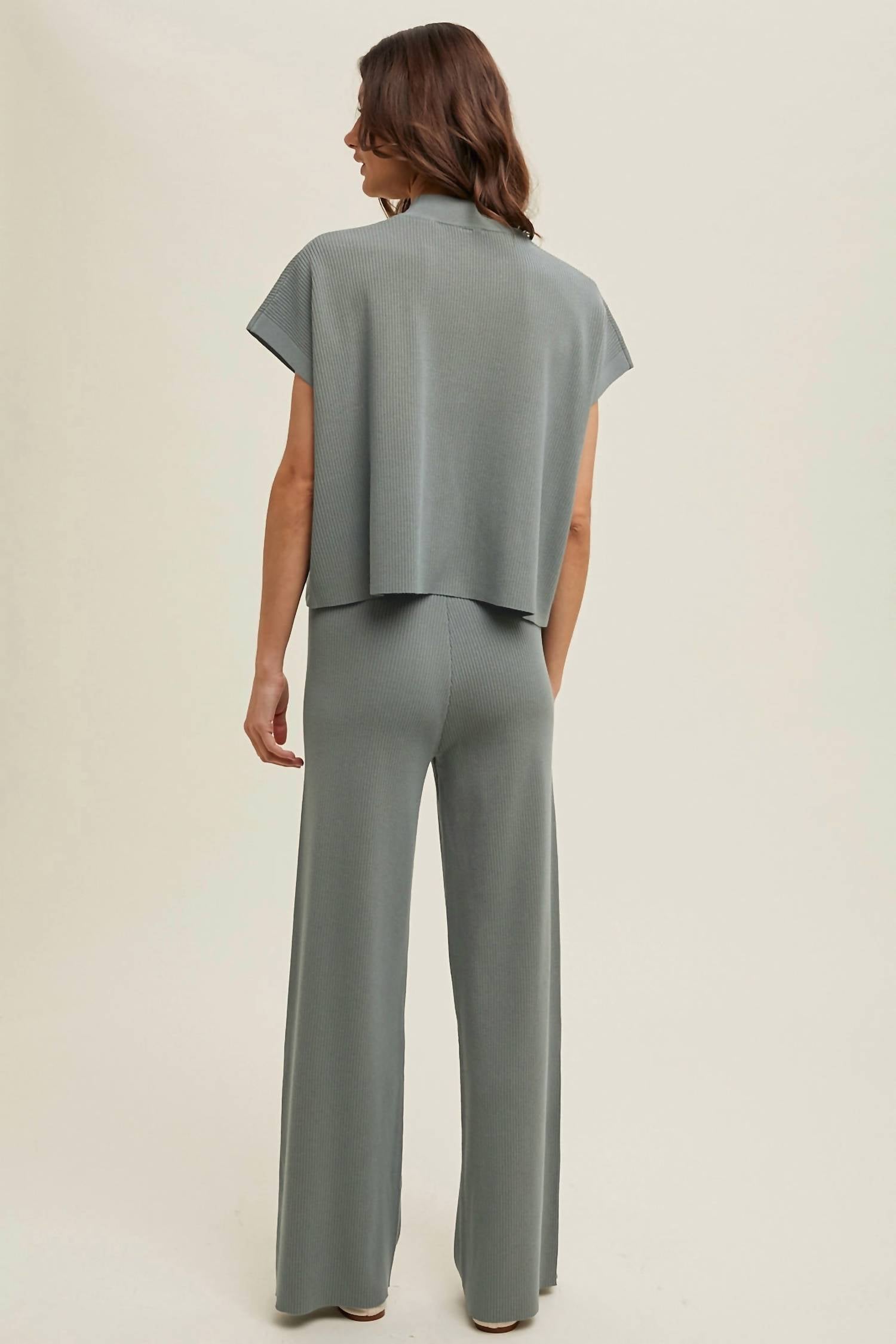Discover comfort and style with the Ribbed Knit Boxy Set by WISHLIST, crafted for relaxed elegance in a sophisticated gray. Featuring short sleeves with a mockneck design, this women's loungewear set ensures a cozy fit and seamless transition from spring lounging to casual outings. Made from a soft viscose blend, it offers a solid pattern with a boxy fit top paired with full-length pants. Care for this set by hand washing. 80% viscose | 20% nylon.
