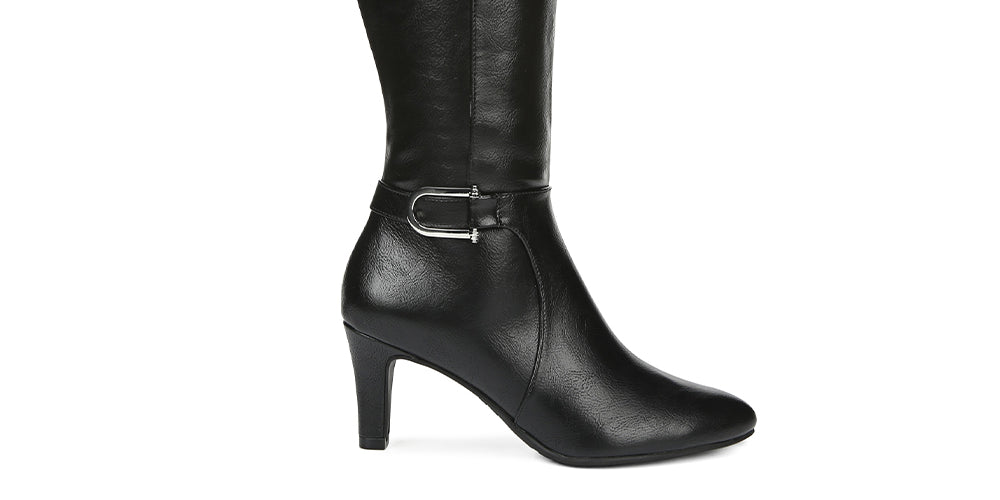 Incremente seu estilo para o frio com a chique e deslumbrante bota social Galina de cano largo da LifeStride. Cabedal em couro sintético resistente à água com bico fino | zíper lateral | elasticidade oculta para maior flexibilidade | e detalhe de fivela metálica. O pacote de conforto Soft System® oferece suporte | flexibilidade | e amortecimento durante todo o dia. O solado de tração proporciona estabilidade extra. Altura ideal: salto de 6,9 cm | Salto 8,5 cm