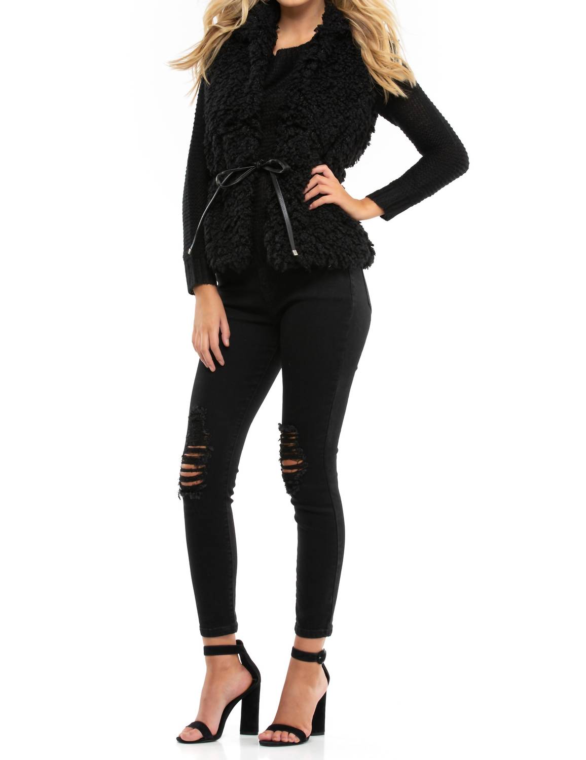 Step into quiet luxury with the WYLDR Country Days Fluffy Gilet, a textured faux fur vest that radiates opulence. Designed with a sleeveless silhouette and a chic V-neckline, this fall-ready vest comes in a versatile black. Featuring a pull-on closure, it includes a removable faux leather belt for added style. Perfect for vacation outings, this fully lined piece combines comfort with sophistication, making it a must-have in your travel wardrobe.