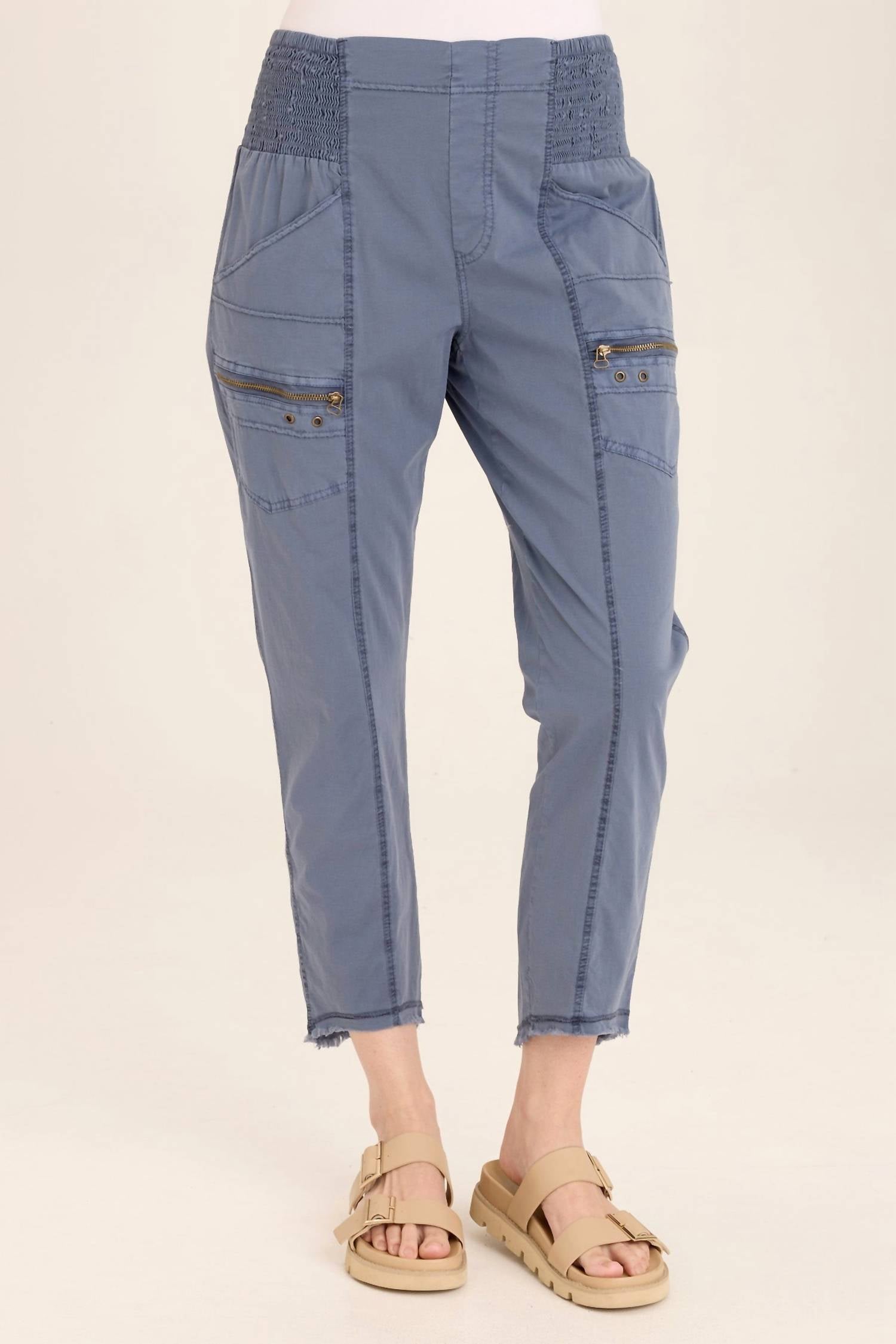 Eleve seu guarda-roupa de férias com a Calça XCVI Acker Slim na cativante tonalidade Hypnotic Pigment. Com comprimento até o tornozelo e modelagem slim, esta calça oferece cós pull-on para um uso sem esforço e inclui painéis franzidos para um toque de textura. Confeccionada em 97% algodão e 3% elastano, possui dois bolsos internos, dois bolsos com zíper e bainha arredondada com acabamento cru. Fechamento: Pull-on. Cuidados: Lavar à mão e secar na horizontal.