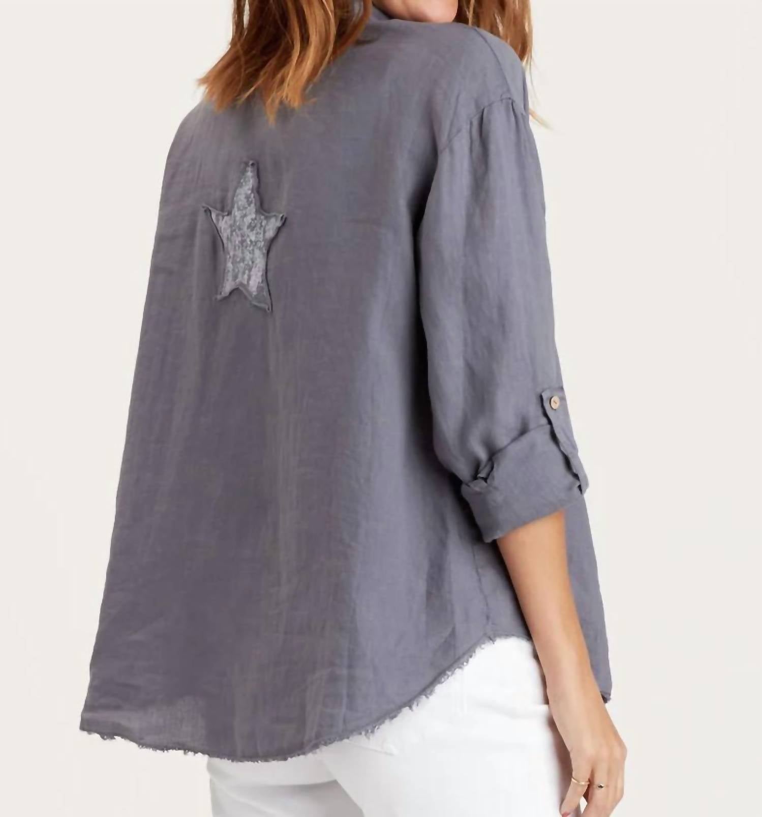 Remendada e desgastada, a camisa Babin Button-Up tem uma estrela serigrafada costurada no centro das costas desta camisa boyfriend de mangas enroladas. Linho leve: 100% linho. Centro da frente: ~22,25" Centro das costas: ~27" Pré-encolhido. Lavável à máquina. Importado.