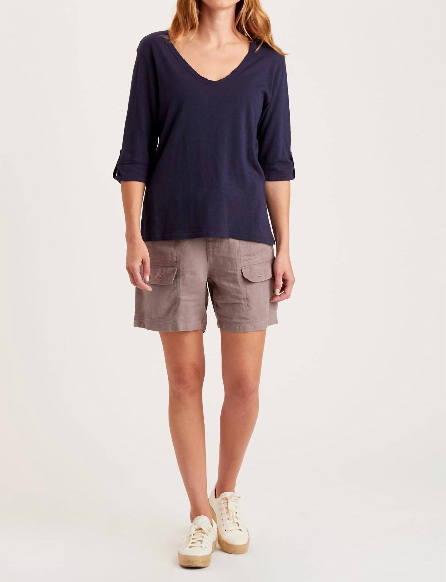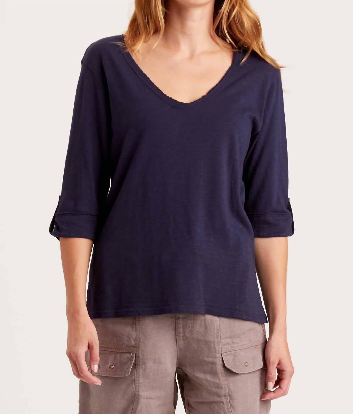Uma blusa de manga comprida que você pode usar com jeans, saias, bem... quase tudo! Apresentamos o Top Christabel da XCVI, um item essencial em azul-marinho sólido para um look elegante e casual. Esta peça feminina apresenta mangas três quartos com detalhes em botões de pressão e abas, confeccionada em uma mistura de algodão macio de 60% algodão e 40% modal. Com acabamento sem acabamento e fendas laterais, oferece um estilo descontraído e descontraído com um decote em V delicado. Fechamento: Puxe para vestir. Cuidados: Pré-encolhido e lavável à máquina, para fácil manutenção.
