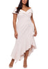 Dramático e deslumbrante | este vestido XSCAPE plus size esvoaça com babados e bainha elegante em formato de lenço. | Aproximadamente 44 de comprimento do centro do pescoço até a bainha. O comprimento é baseado no tamanho 4 e varia 1/4 entre os tamanhos | Elástico e com suporte | Decote ombro a ombro | Fechamento com zíper nas costas | Babado na frente; bainha em formato de lenço