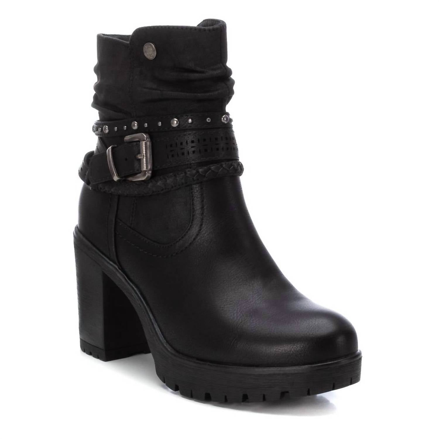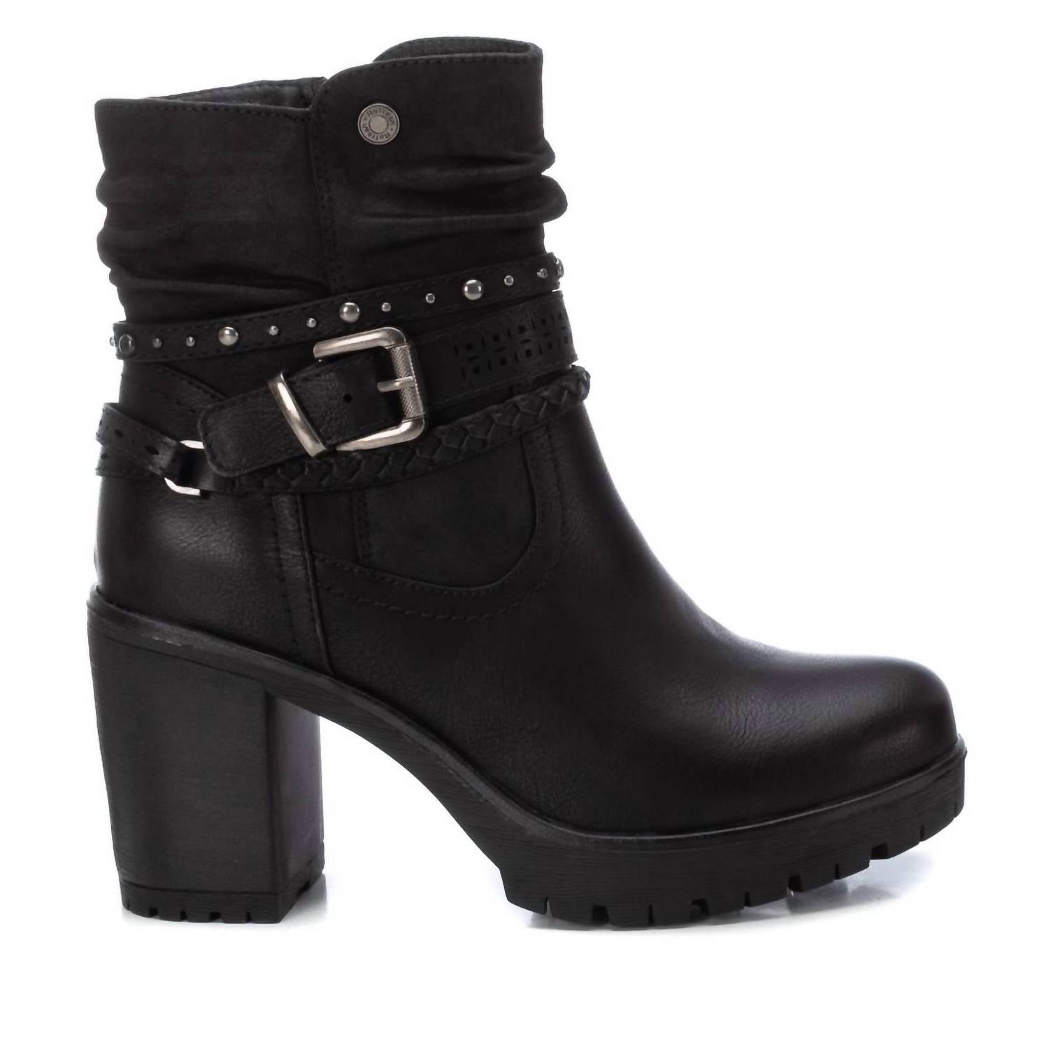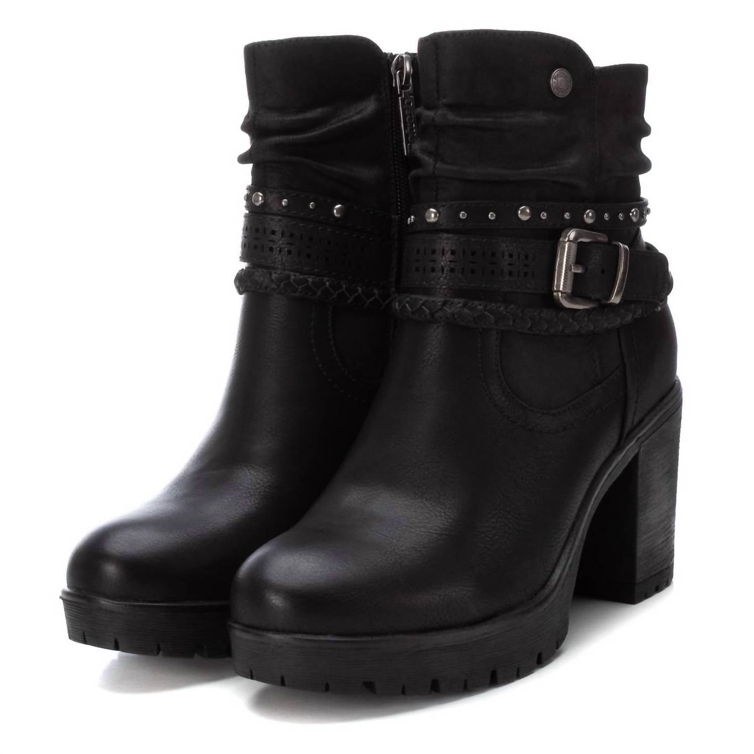 Esta bota casual de salto alto apresenta salto bloco de 8,9 cm, zíper lateral, fivela decorativa e detalhes metálicos. Confeccionada em couro sintético, possui palmilha acolchoada e solado de borracha antiderrapante para maior conforto e estabilidade.