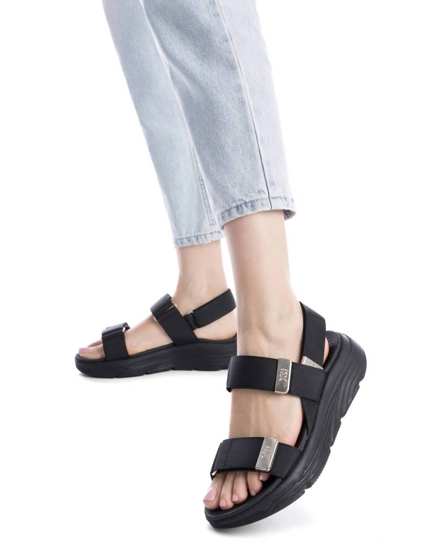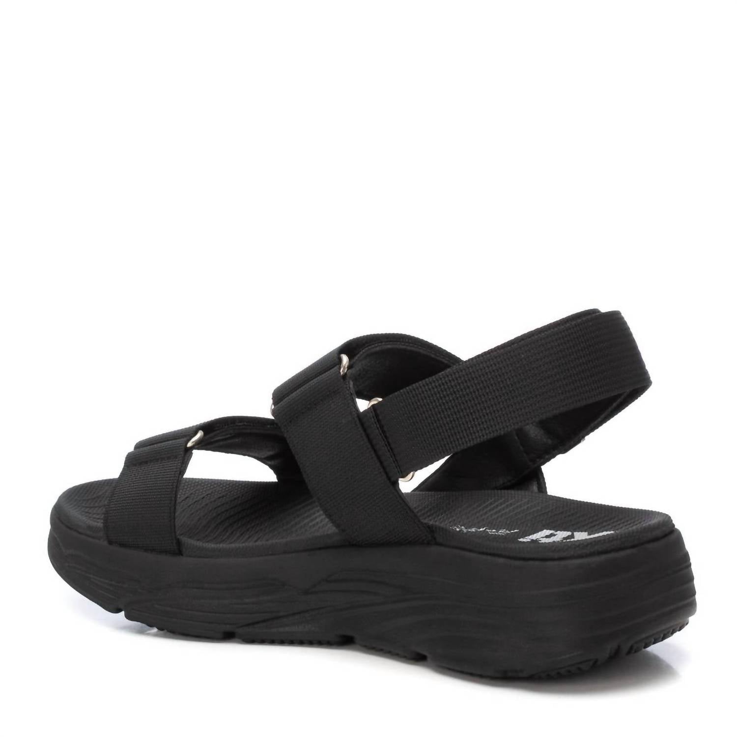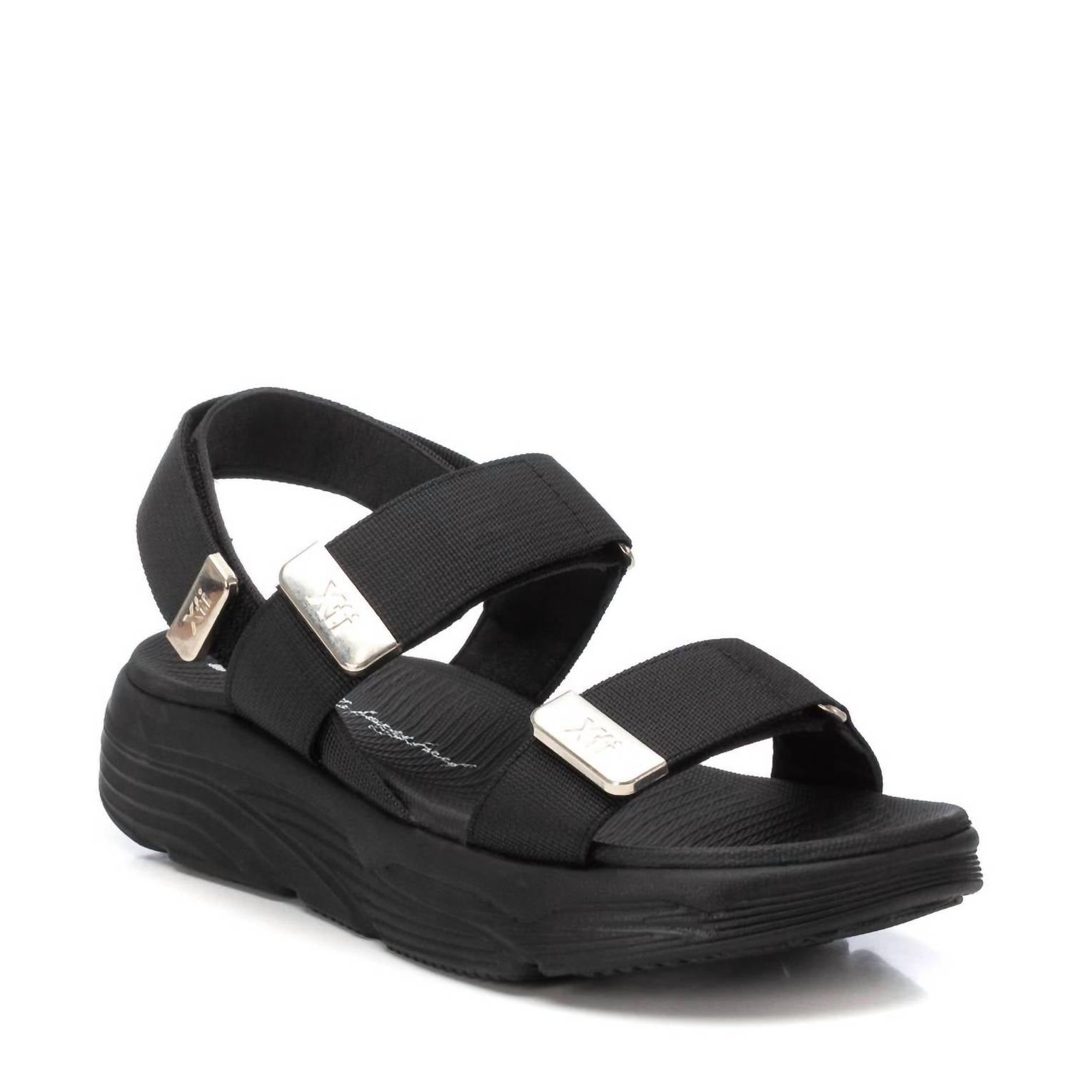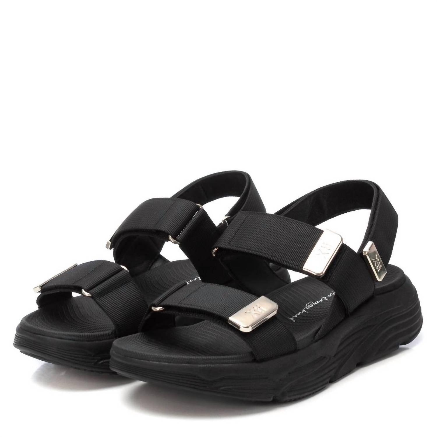 Saia com estilo com as Sandálias Anabela Casuais Femininas da Xti, criadas para conforto e um toque inovador. Estas sandálias são feitas de material têxtil de alta qualidade e apresentam um solado esportivo e antiderrapante. Projetadas com tira dupla tipo pá e fecho de velcro adesivo, elas incluem detalhes metálicos que elevam seu estilo casual. Com salto anabela baixo medindo de 1 a 3 cm, estas sandálias pretas têm certificação vegana da PETA e são perfeitas para qualquer passeio casual.