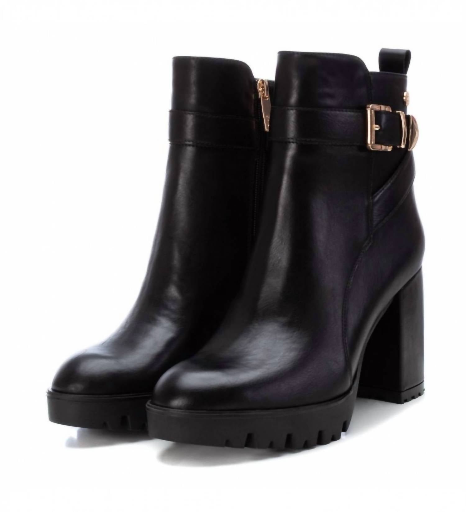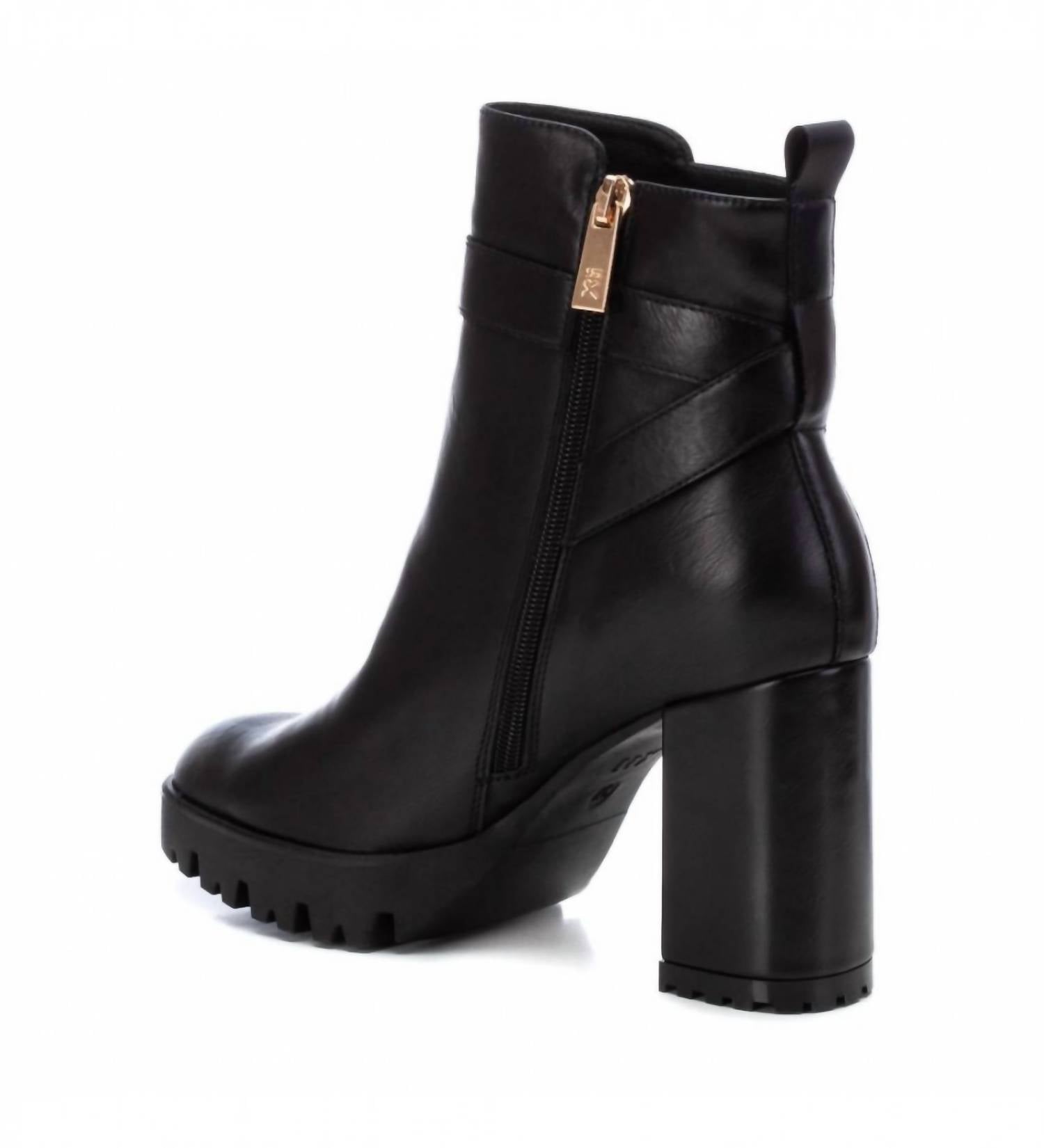 Saia com confiança e mostre seu gosto impecável com estas botas versáteis e estilosas. Seu estilo clássico fará você recorrer a elas estação após estação. Confeccionado em couro sintético premium. Possui zíper lateral elegante e puxador traseiro prático. Tira no tornozelo, adornada com uma fivela de metal elegante. Projetado com estrutura leve. Solado de borracha antiderrapante para apoio seguro. Salto de 8,9 cm.