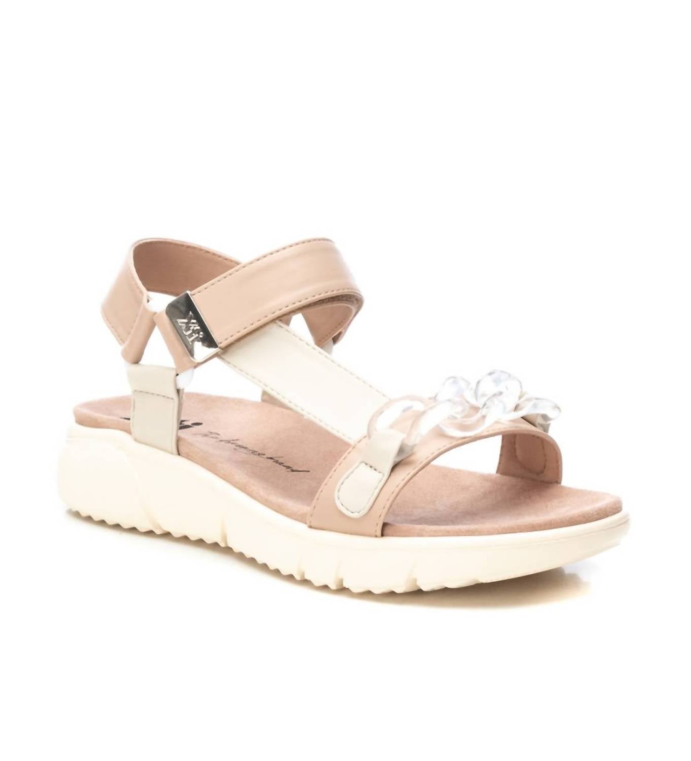 Esta sandália vai levar você do brunch ao jantar e a tudo o mais. Confeccionado em camurça. Apresenta corrente decorativa translúcida, fecho com tira adesiva para um ajuste seguro e solado grosso com solado antiderrapante.