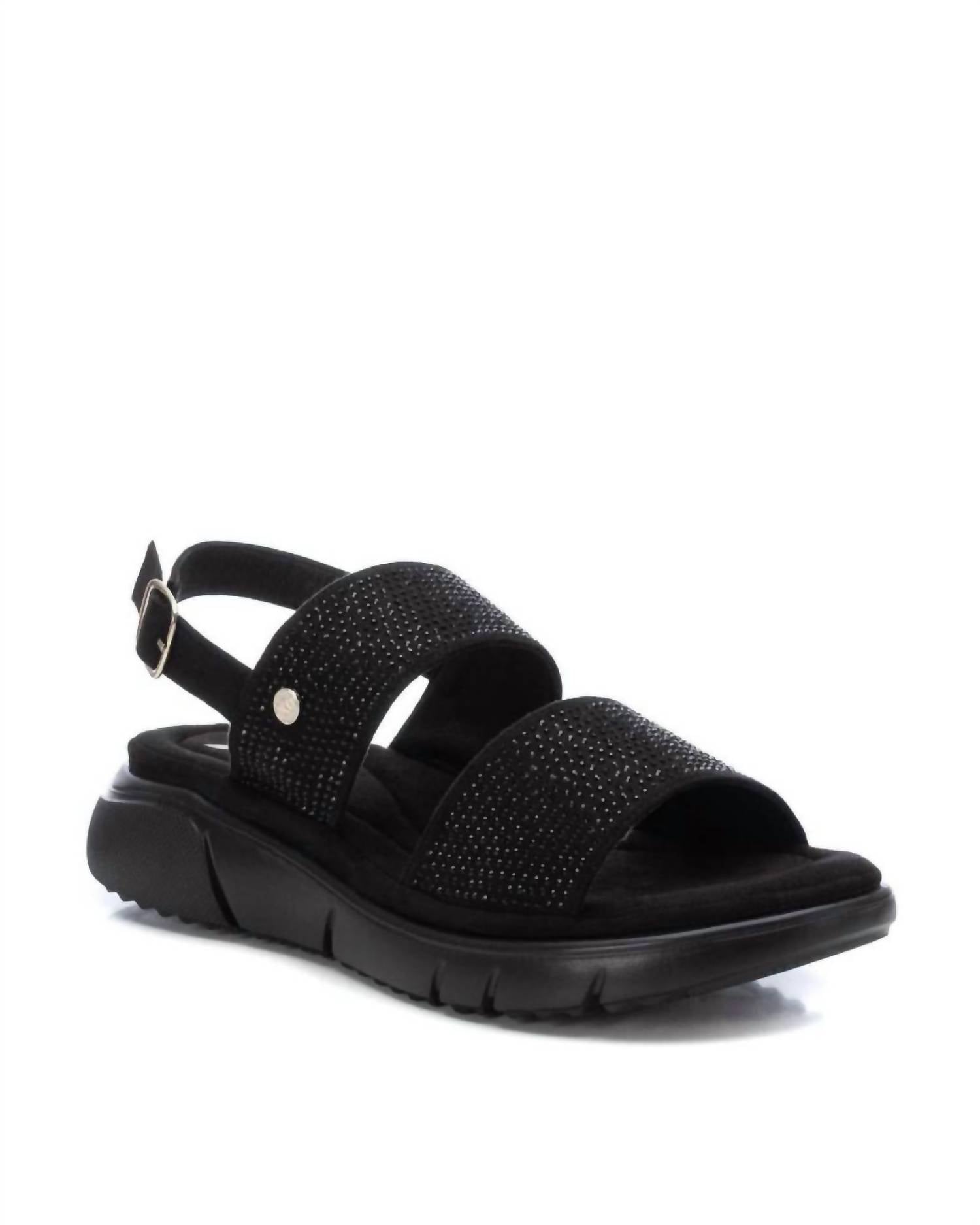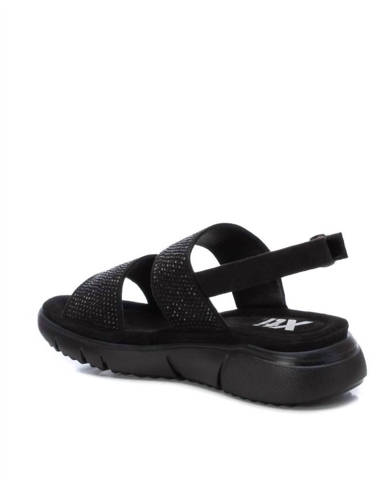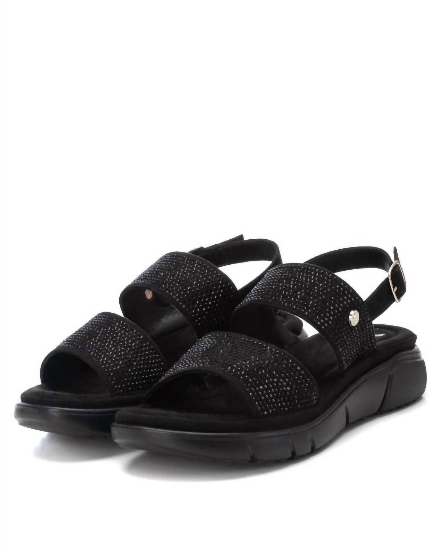 Confeccionado em camurça sintética. O design de tira dupla é intrinsecamente adornado com minipedras decorativas. O fecho de fivela garante um ajuste seguro e ajustável, enquanto o solado de borracha antiderrapante e durável proporciona firmeza.