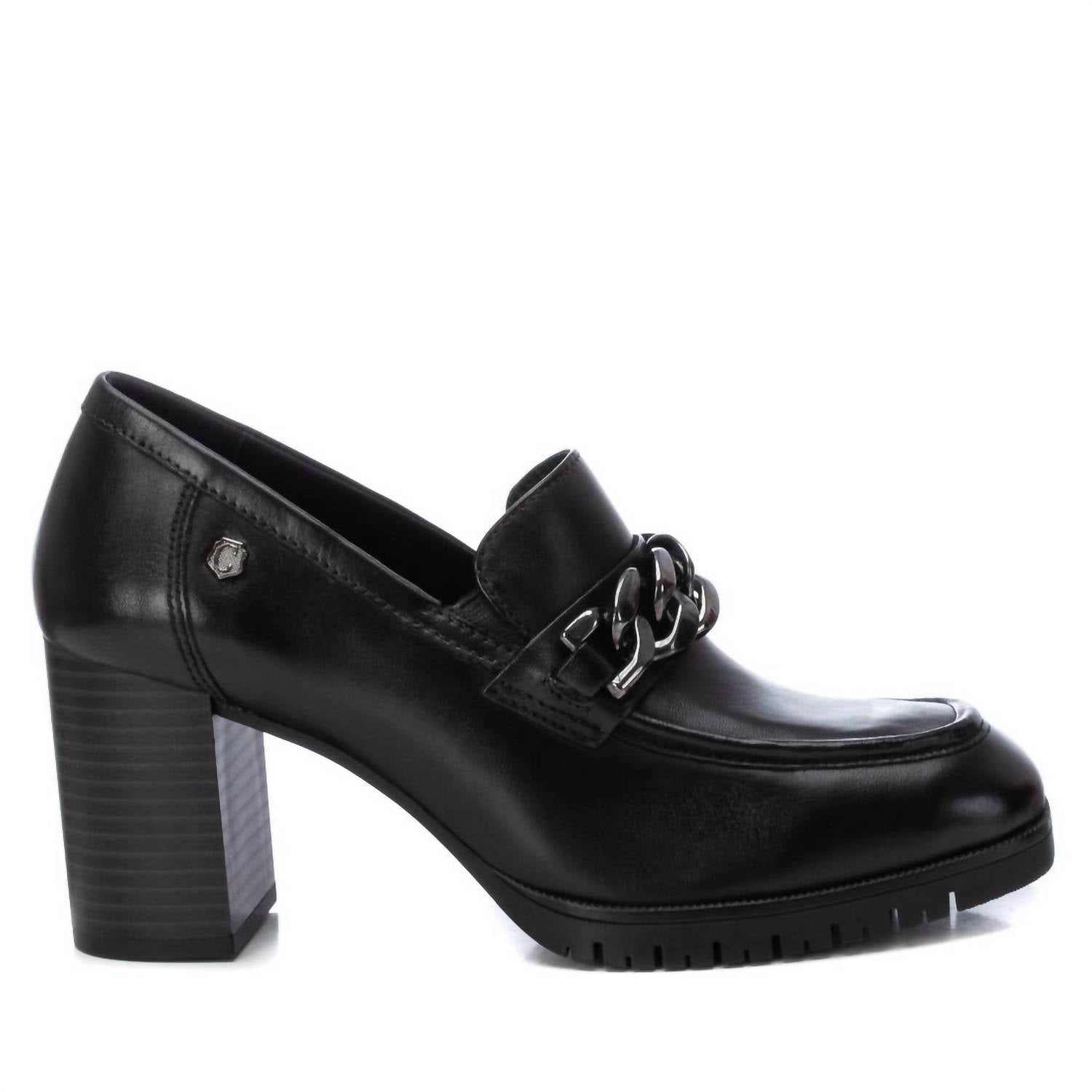 Entre na sofisticação com os mocassins femininos de couro Xti na cor preta clássica. Confeccionados em couro de alta qualidade, estes mocassins oferecem um toque luxuoso e durabilidade excepcional. Com bico quadrado e salto bloco estiloso de 7,9 cm, eles garantem conforto e um toque de estilo. Eleve seu visual com o detalhe decorativo em metal e desfrute de uma mistura de estilo atemporal e toque moderno.