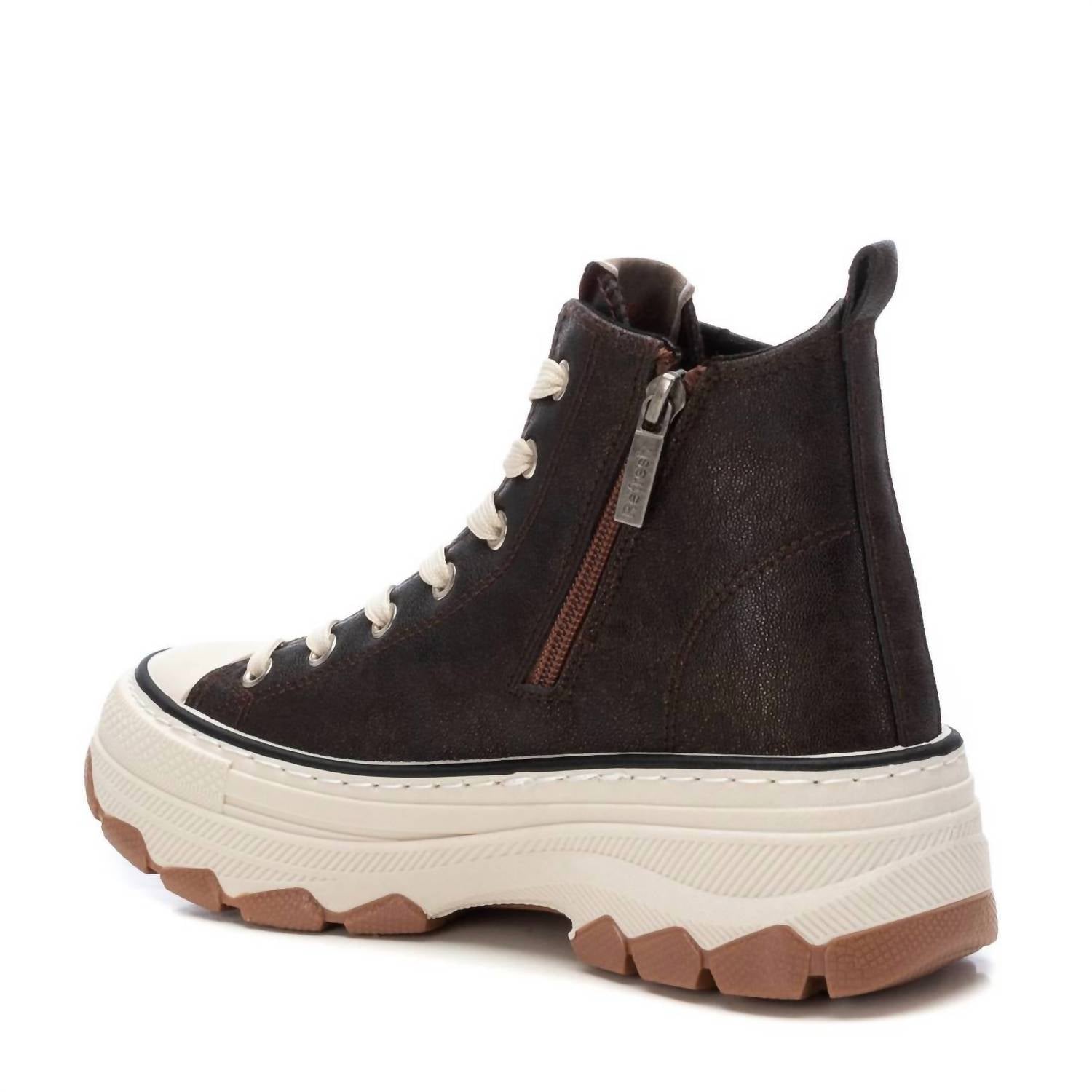 Dê seus passos diários com esses tênis adoráveis. Estas botas femininas apresentam um elegante acabamento em couro sintético bronze, zíper lateral, cadarços ajustáveis e solado de borracha antiderrapante. Com salto baixo e palmilha removível, oferecem conforto e estilo moderno para o dia a dia.