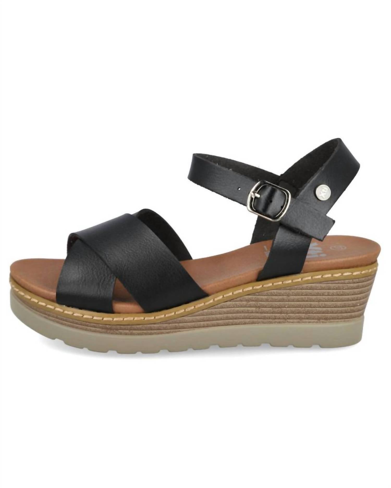 Estas sandálias de tiras cruzadas apresentam um cabedal elegante com tiras cruzadas e fecho de fivela metálica para um ajuste seguro. Com confortáveis 5 cm e um salto anabela resistente, elas proporcionam a sustentação perfeita. O solado de borracha durável e antiderrapante oferece excelente aderência, tornando-as ideais para uso durante o dia todo.
