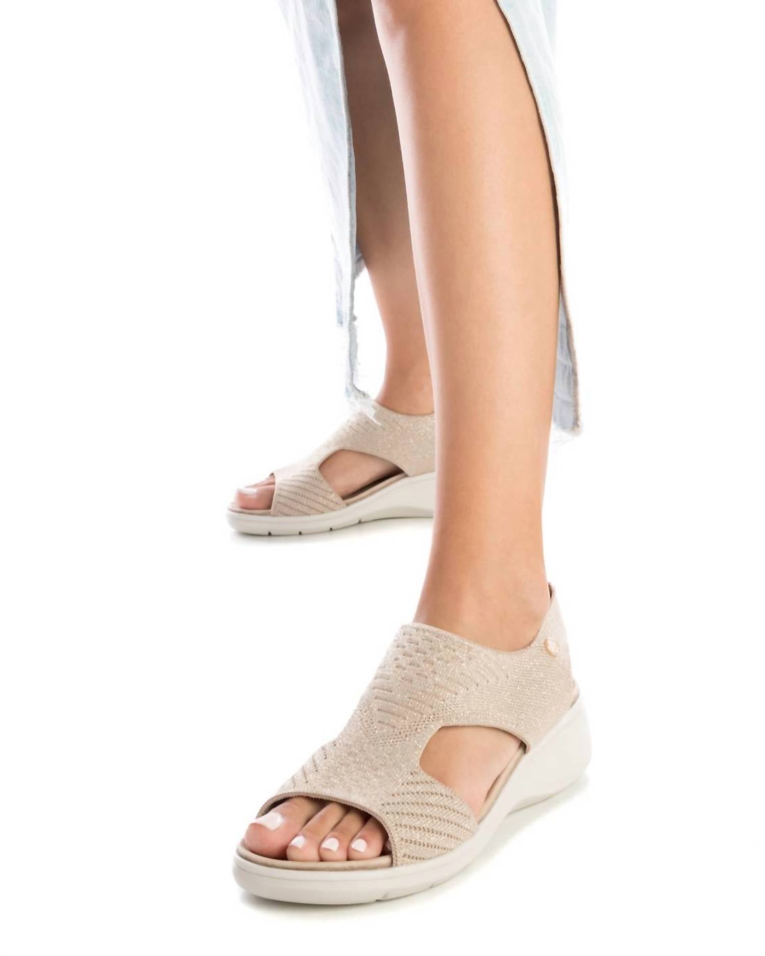 Clássico e fofo, perfeito para usar o dia todo. Adoramos esta sandália. Aprimore sua coleção de calçados com as Sandálias Anabela Femininas da Xti, projetadas para oferecer estilo e conforto. Confeccionadas em tecido bege elástico de alta qualidade, estas sandálias apresentam palmilha acolchoada e confortável e sola de borracha resistente e antiderrapante, perfeitas para uso diário. Com um salto anabela elegante de aproximadamente 1,2 cm de altura, elas oferecem elevação e suporte sutis, tornando-as ideais para qualquer passeio casual. Com orgulho, certificação vegana da PETA, estas sandálias modernas são a sua escolha de moda sem culpa.