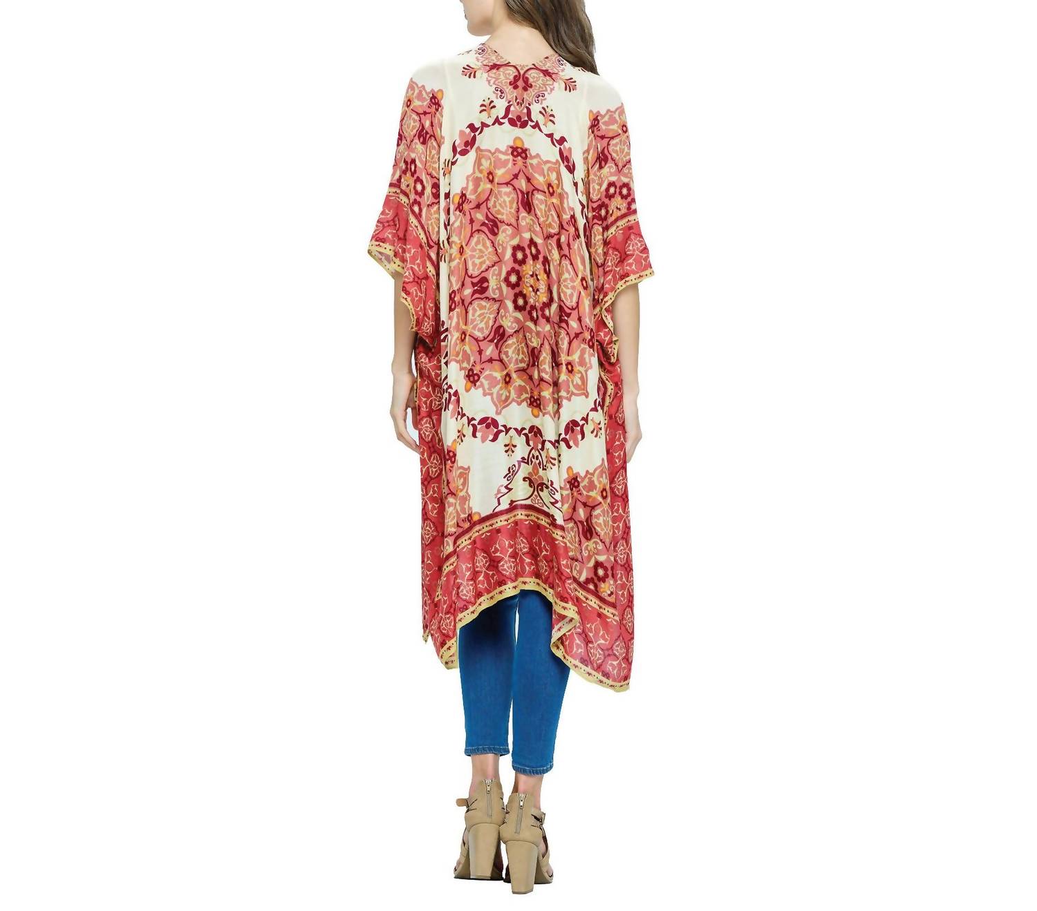 Embrace a boho chic look with the Boho Floral Mandala Kimono Wrap by Yak & Yeti. This maroon piece boasts a loose fit with lightweight viscose for effortless wear and comfort. Its half sleeves and open front design are complemented by a trendy floral mandala print and side slits for added flair. Perfect for a flowy casual style, this kimono wrap is a must-have for any wardrobe.